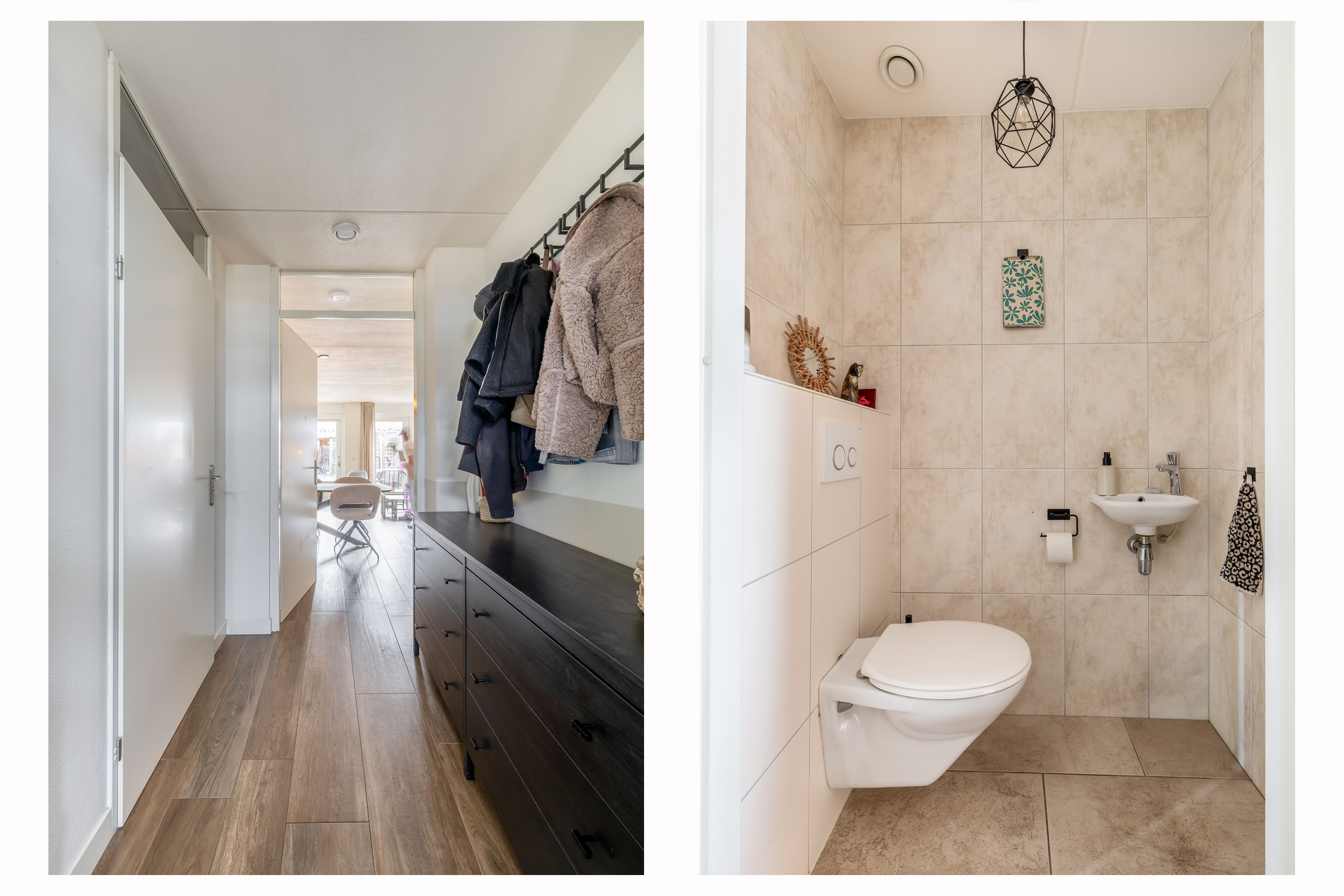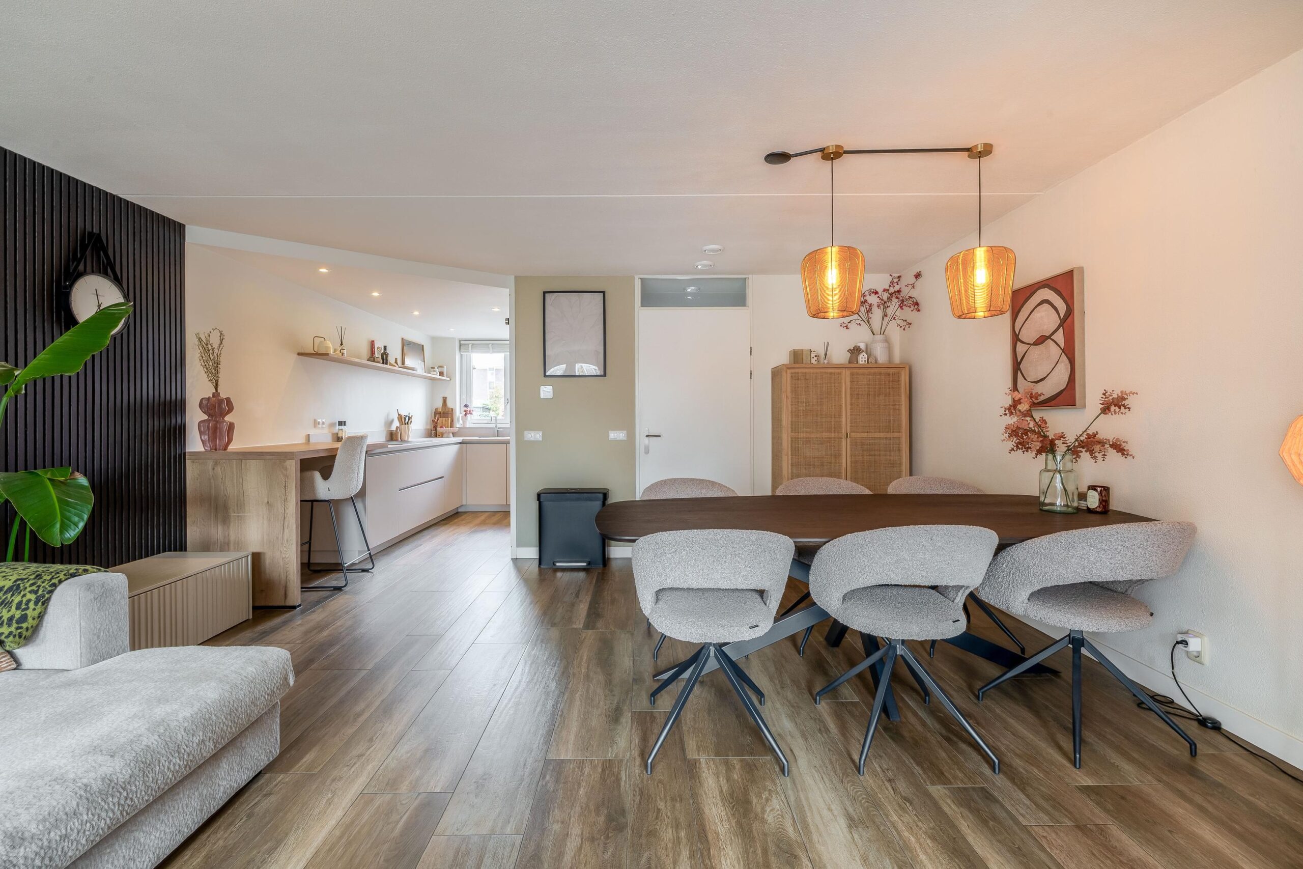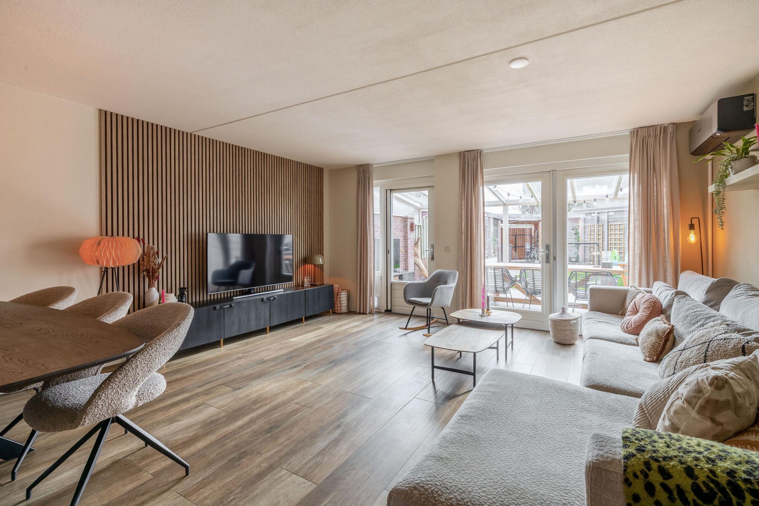Bij binnenkomst kom je in de ruime hal met keramische tegelvloer welke toegang geeft tot de eerste verdieping, het toilet met fonteintje, een praktische bergkast en de woonkamer. De lichte en ruime woonkamer vormt een heerlijke leefruimte waar je comfortabel met het gezin kunt ontspannen. De moderne zandkleurige keuken uit 2024 sluit hier mooi op aan en is van alle gemakken voorzien. Zo beschikt de keuken over een inductiekookplaat met geïntegreerde afzuiging, een Quooker, stoomoven, combi-oven, vaatwasser, koelkast en een aparte vriezer. Alle apparatuur is van het merk AEG. Aan het gezellige barretje met houtlook, dat naadloos aansluit op de keuken, kun je ’s ochtends rustig de dag beginnen. De gehele begane grond is voorzien van vloerverwarming en in de woonkamer zorgt een airco voor extra comfort.
