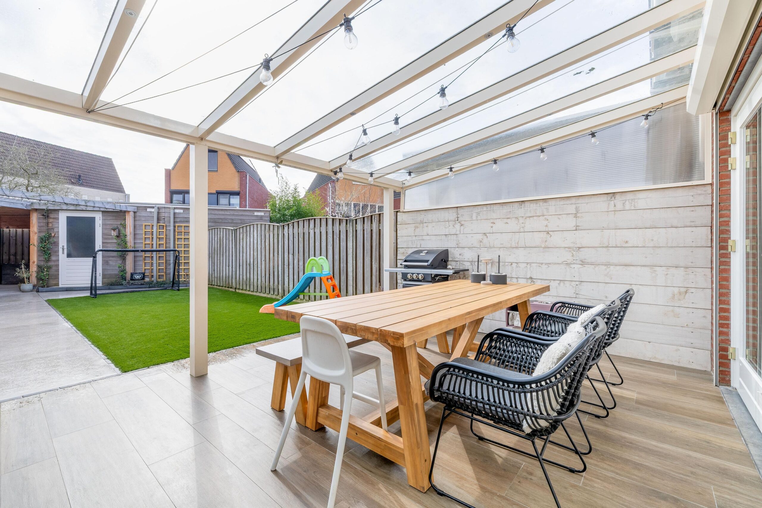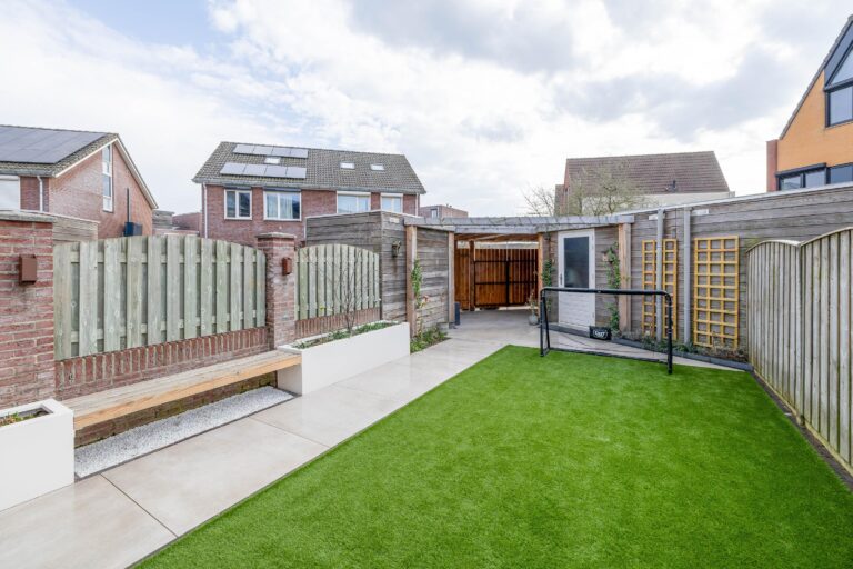 Via de openslaande deuren in de woonkamer stap je direct de tuin in. De vloer van de woonkamer loopt stijlvol door tot onder de overkapping, waardoor binnen en buiten mooi in elkaar overlopen. De overkapping is voorzien van een glazen dak, inbouwspots en internet aansluiting, waardoor het hier het hele jaar door prettig vertoeven is. De tuin is onlangs en zeer netjes aangelegd met kunstgras en een verzorgd pad naar de schuur, welke is voorzien van elektra. Aansluitend bevindt zich een houten overkapping met dubbele poort, waar eventueel ook de mogelijkheid bestaat om een garage te realiseren. In de vloer van de tuin zijn bovendien subtiele verlichtingsspots verwerkt.