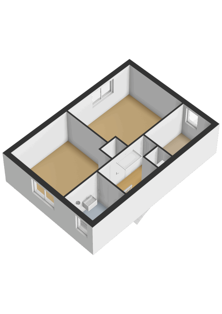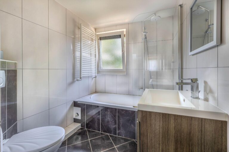 De slaapkamers (ca. 5,5m², 14m² en 17m²) zijn allemaal licht en voorzien van rolluiken. In de geheel betegelde badkamer (ca. 4m²) zijn een ligbad met douche, toilet en wastafelmeubel aanwezig. Het raam zorgt voor daglicht en tevens natuurlijke ventilatie.