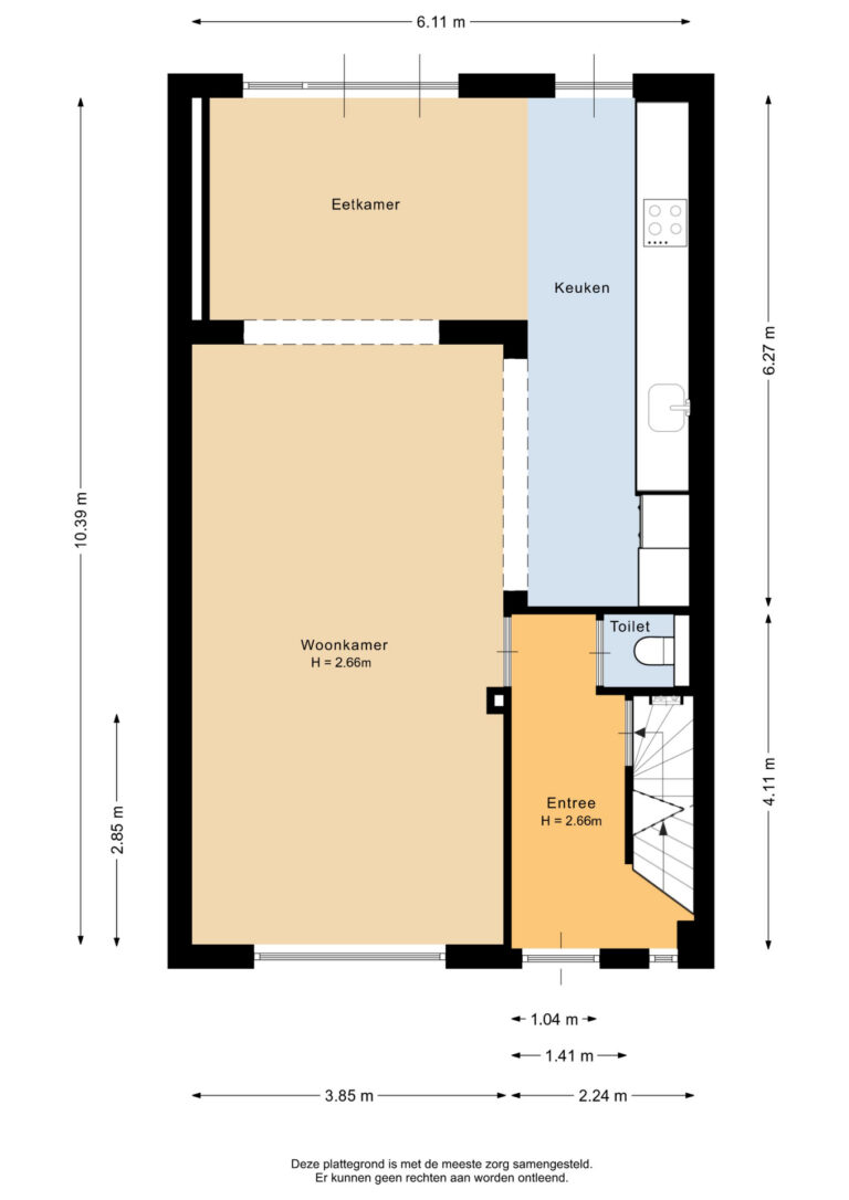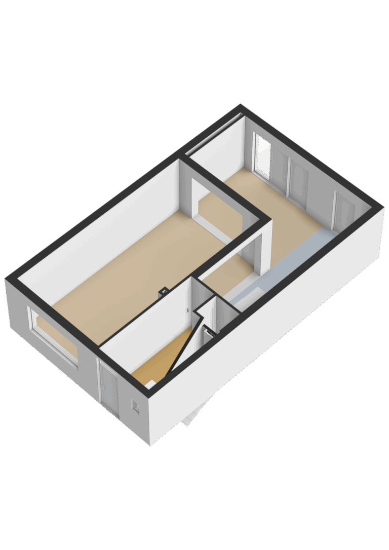 De hal is voorzien van het toilet. In de hal ligt een houten vloer die doorloopt in de woonkamer met open keuken.