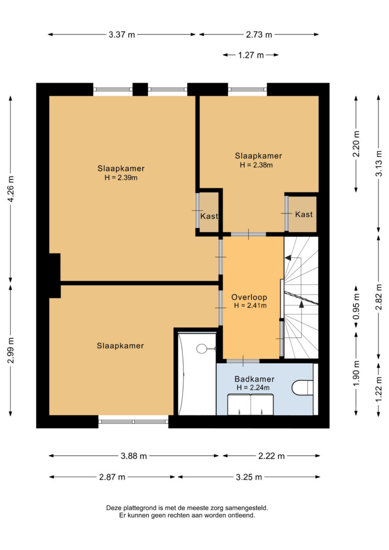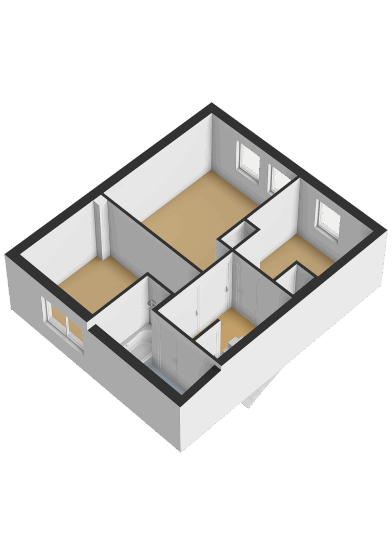 Vanuit de overloop zijn de drie slaapkamers (ca. 7m², 10m² en 15m²) en de badkamer bereikbaar. Op de overloop en twee slaapkamers ligt een laminaatvloer. De andere slaapkamer is voorzien van een houten vloer. Twee slaapkamers hebben een muurkast.