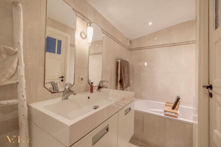 In de geheel betegelde badkamer (ca. 4,5m²) zijn een ligbad met douche, dubbel wastafelmeubel, toilet en mechanische ventilatie aanwezig.