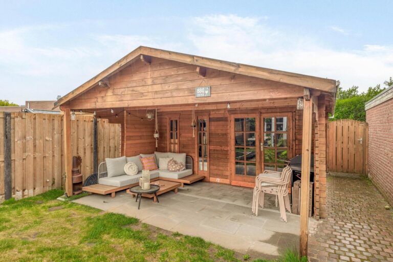 De achtertuin ligt op het westen en is voorzien van een vrije achterom. Aan de woning bevindt zich een groot betegeld terras. Het ruime, houten tuinhuis (ca. 16m²) met overkapping (ca. 14m²) is voorzien van elektra.