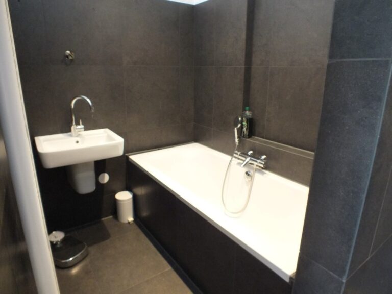 Vanuit de entree bereikt u de aan de linkerzijde de ruime slaapkamer met badkamer ensuite. De badkamer is voorzien van een ligbad, inloopdouche, handdoekradiator en wastafel.