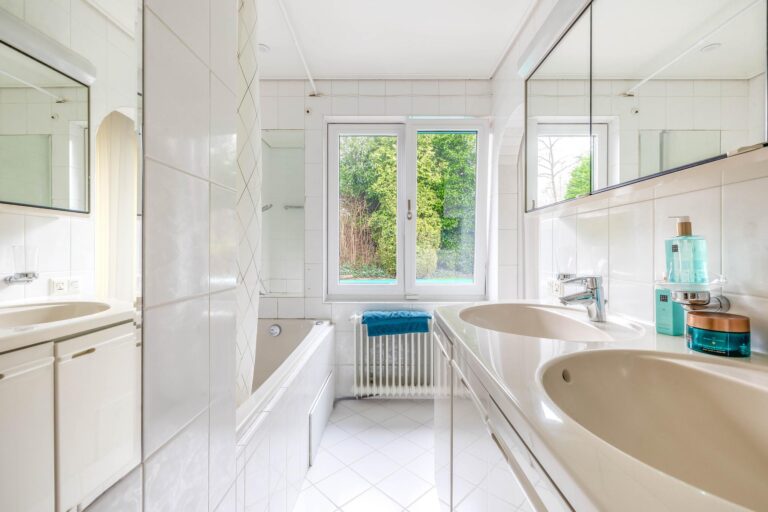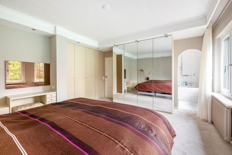 De grote slaapkamer (ca. 21m²) heeft een vaste kastenwand en biedt toegang tot de en-suite badkamer. De badkamer (ca. 5m²) is voorzien van een ligbad met douche en dubbel wastafelmeubel.