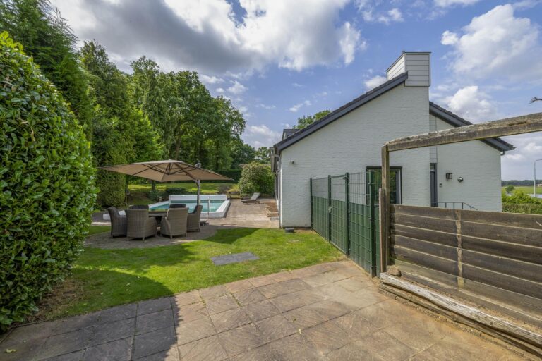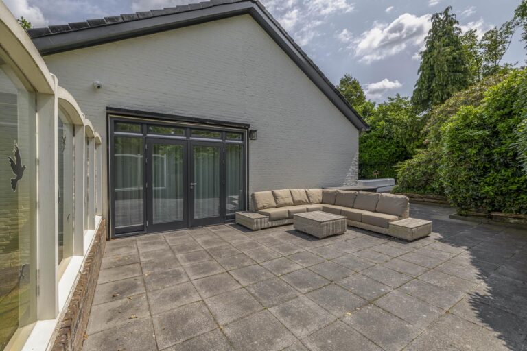 De tuin loopt volledig rondom de woning. Aan de linkerzijde biedt een terras een mooi uitzicht op de Maas. De tuin is zeer groen aangelegd. Het zwembad is circa. 10x5m. Op de eigen oprit is plek voor meerdere auto’s.