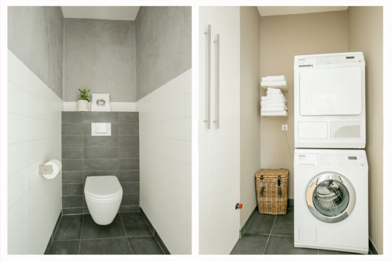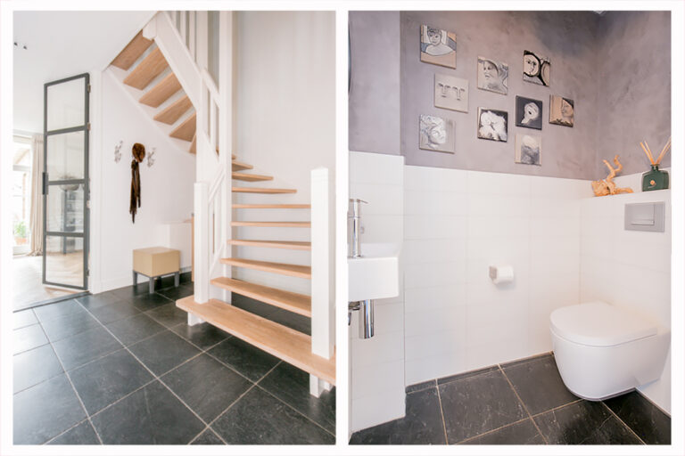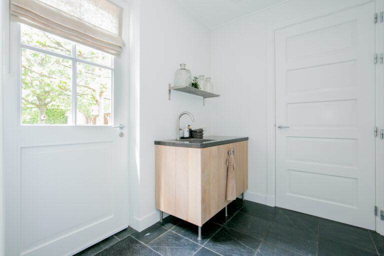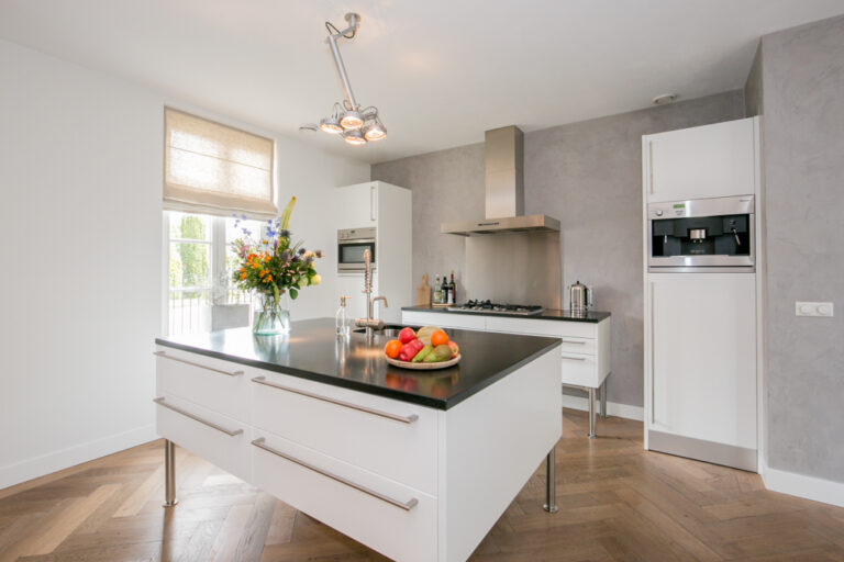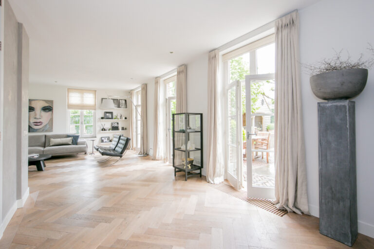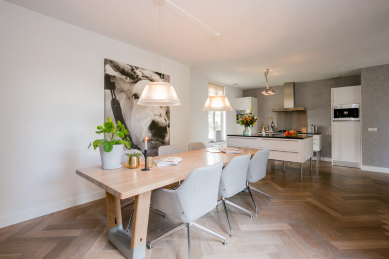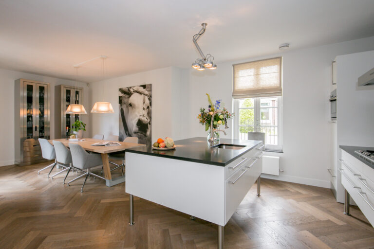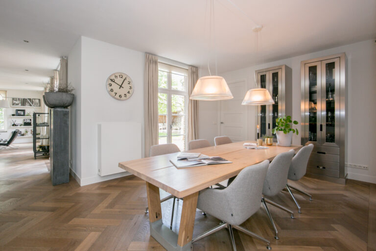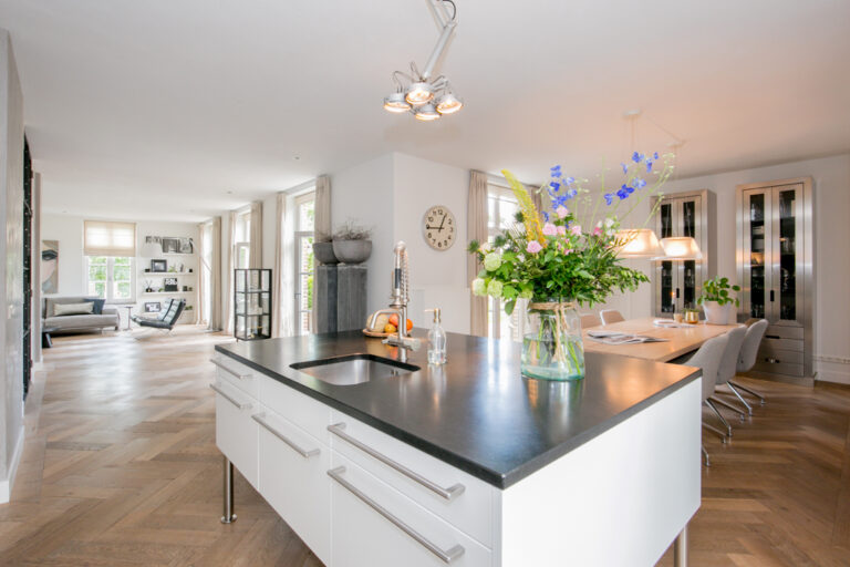 Via de fraaie en ruime hal is de heerlijk lichte woonkamer, de speelkamer en het grote, luxe uitgevoerde toilet bereikbaar. Het toilet is uitgevoerd met een hangcloset en fonteintje. De woonkamer, die via 2 glazen deuren van de hal wordt gescheiden, is L-vormig en biedt veel daglicht en ruimte. De grote keuken van ca. 30 m² is v.v. een hoogwaardige Bulthaup inrichting met een 5 pits gaskookplaat, afzuigkap, koelkast, combi-oven-magnetron en als finishing touch een Nero Assoluto granieten werkblad. Grenzend aan de keuken is een groot portaal met een keukenblok. Via dit portaal zijn de garage en aparte bijkeuken met ruime koelkast en vriezer bereikbaar. De grote inpandige garage van ca. 30 m² heeft een grote zolder als handige bergruimte. De begane grond is v.v. een zeer mooie, in visgraat gespijkerde parketvloer.