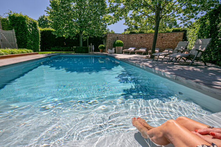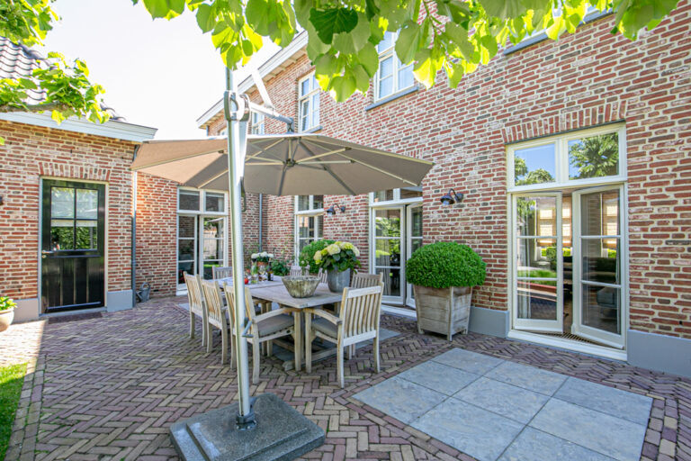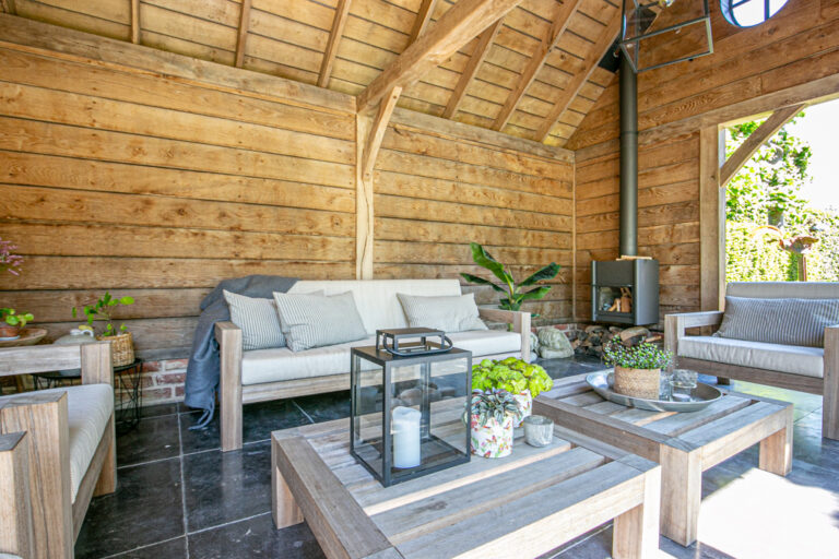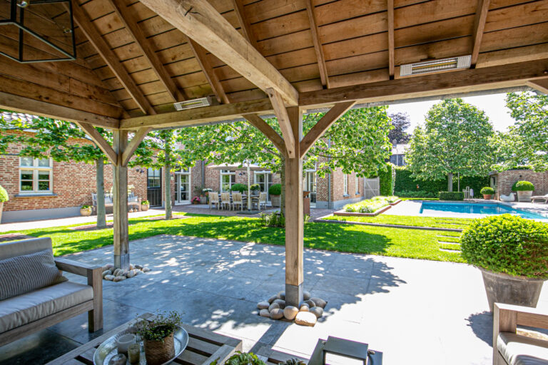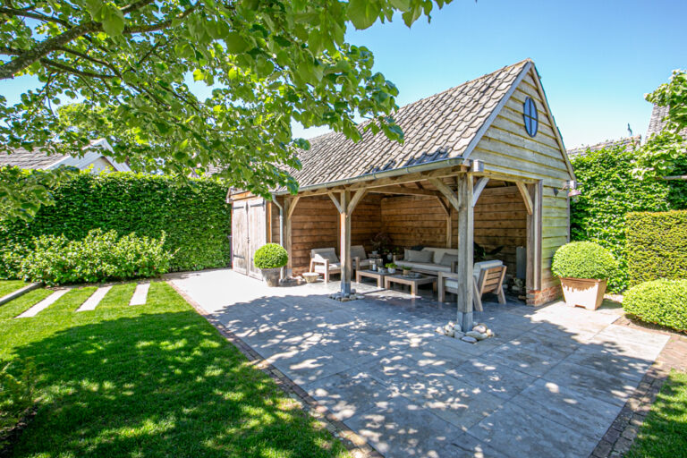 De tuin biedt veel zon gedurende de hele dag en er is sprake van optimale privacy. Het geheel is mooi aangelegd met o.a. een traditioneel gebouwd eikenhouten bijgebouw met afsluitbare schuur en grote overkapping met een houtkachel, een zwembad met buitendouche, solardeck en een poolhouse met toilet en wastafel.