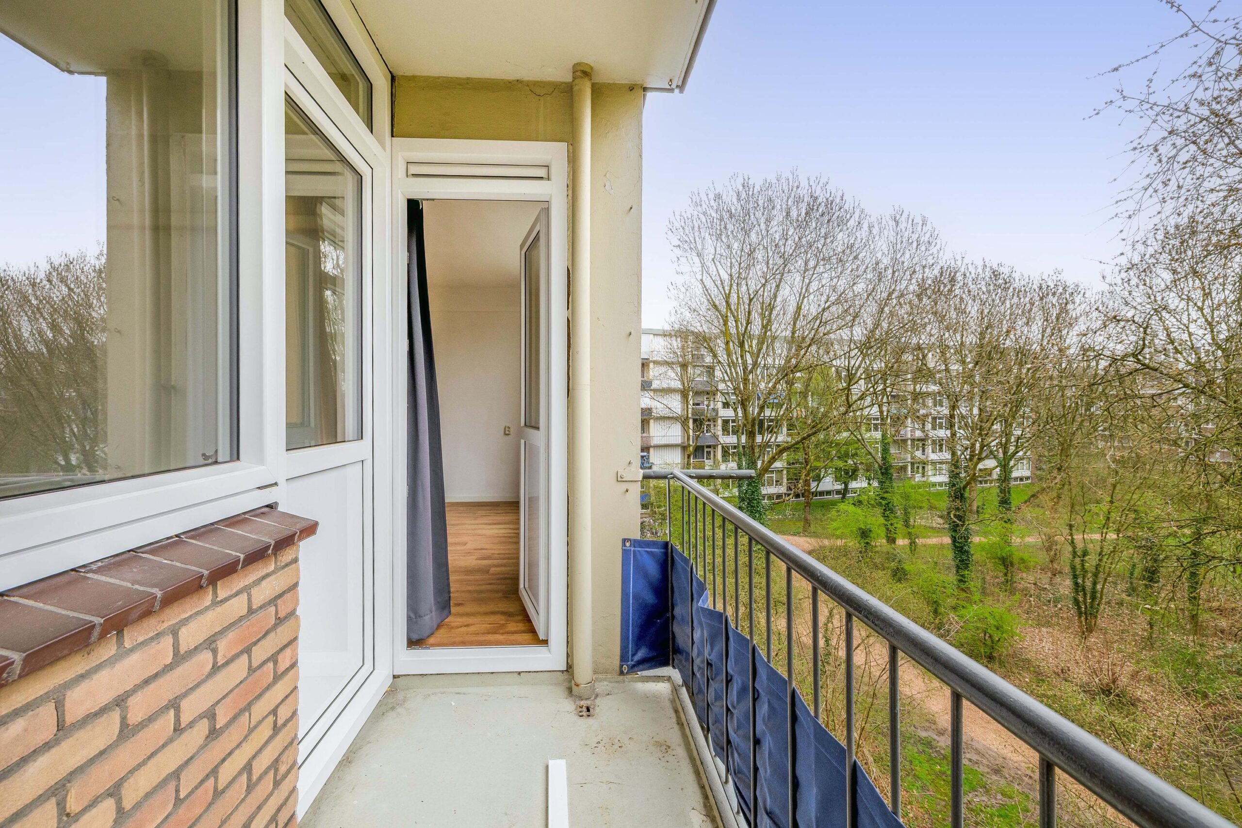 De slaapkamer aan de achterzijde beschikt over een klapraam met directe verbinding naar het balkon, wat zorgt voor extra licht en ventilatie. De badkamer is modern ingericht en voorzien van een ruime inloopdouche en een wastafel met meubel.