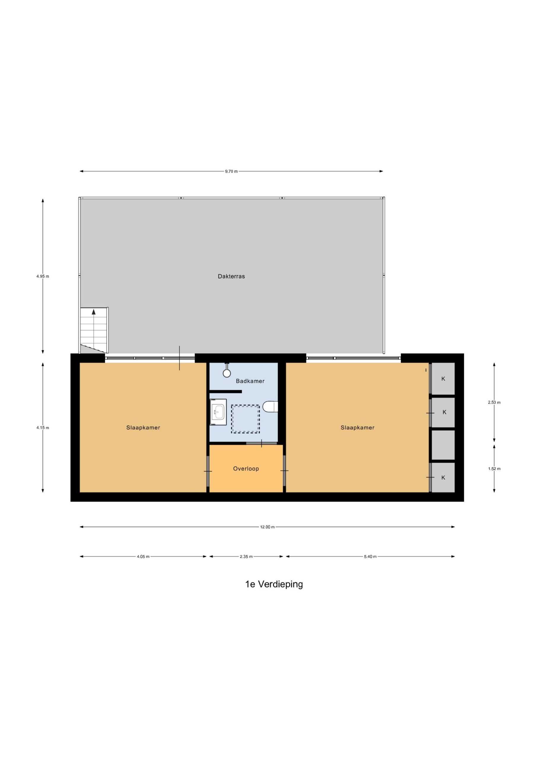 Hier bevinden zich nog twee ruime slaapkamers. De grootste kamer beschikt over praktische inbouwkasten. Vanuit de andere slaapkamer heb je toegang tot het royale dakterras (ca. 48 m²), welke via een trap ook direct met de tuin verbonden is.