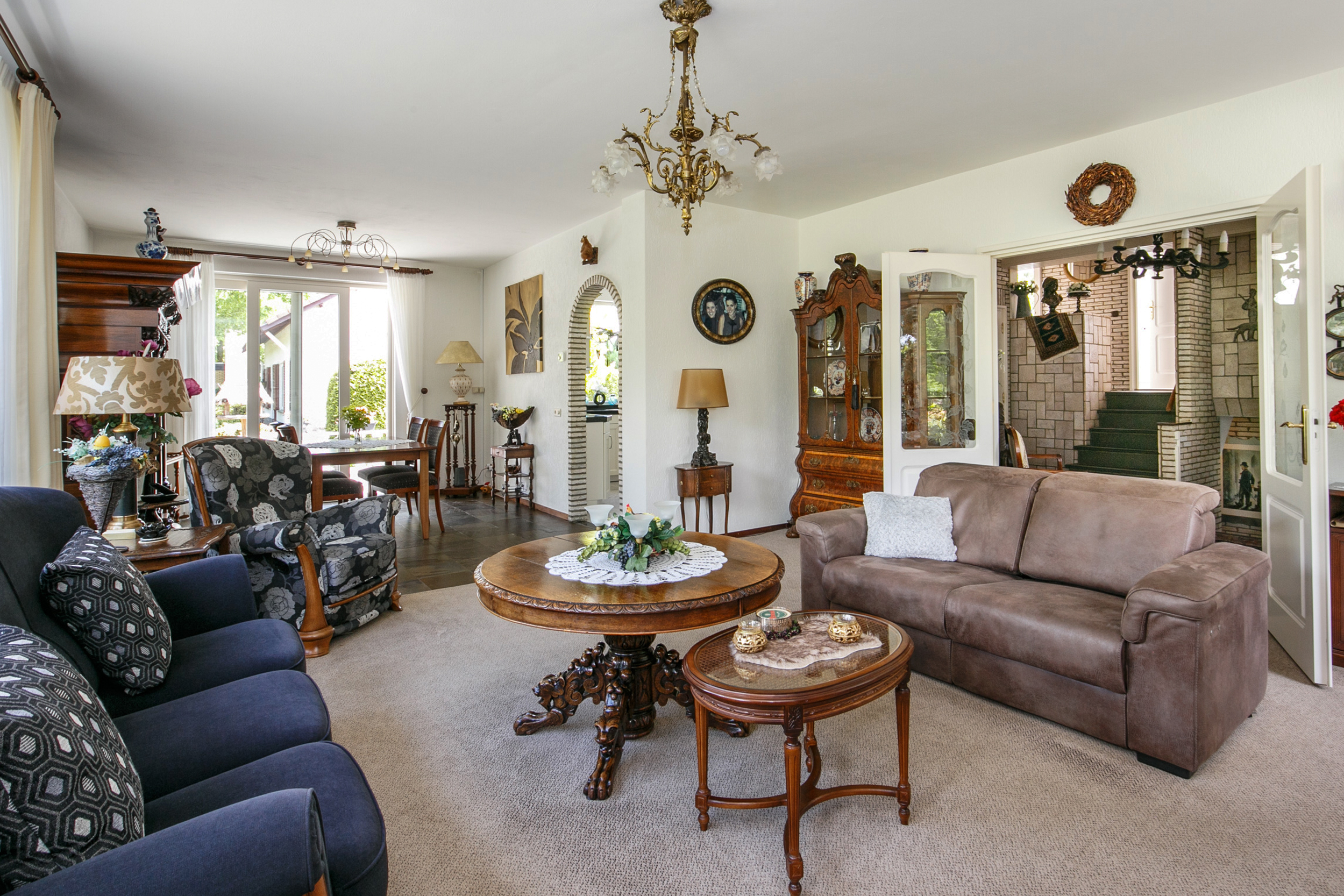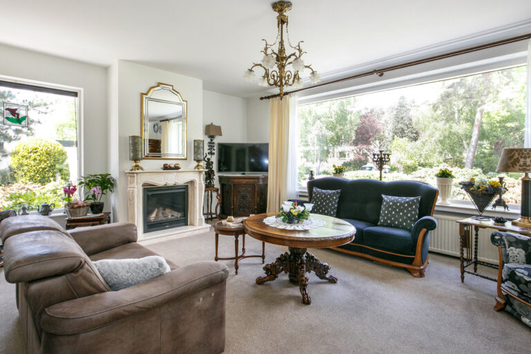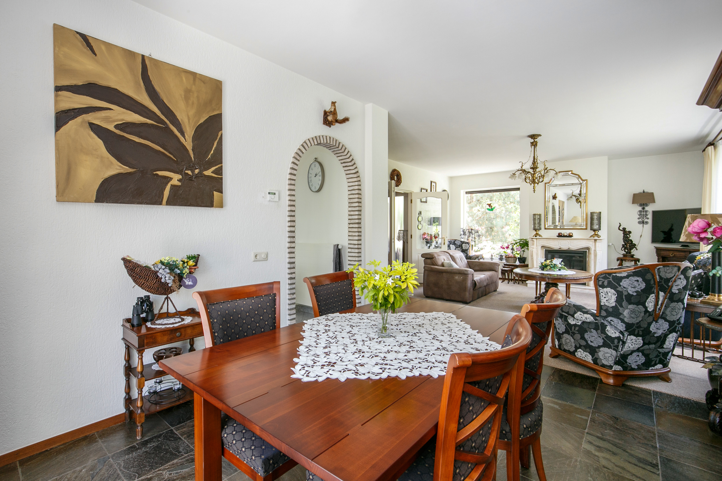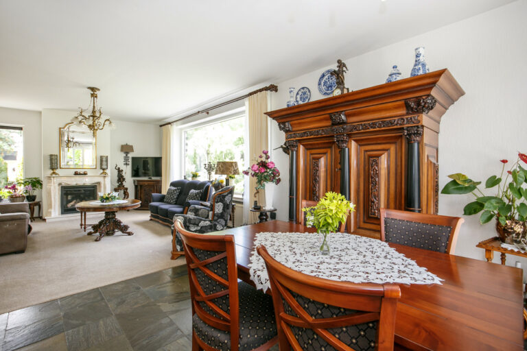 De lichte woonkamer (ca. 45 m²) is voorzien van een leisteen vloer, gestucte wanden en een gezellige gashaard. De grote schuifpui biedt toegang tot de tuin en zorgt voor een prachtig uitzicht op de groene omgeving.