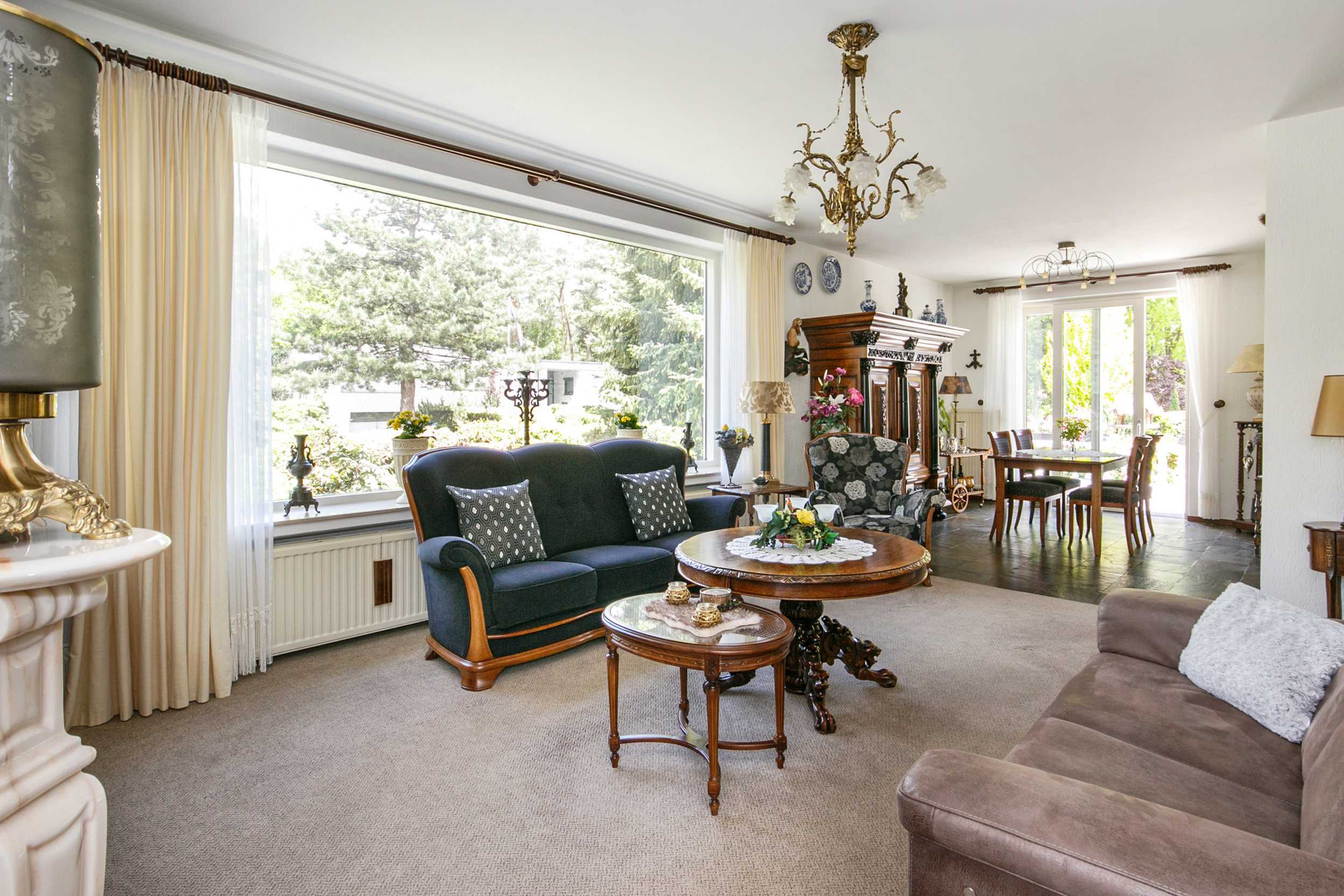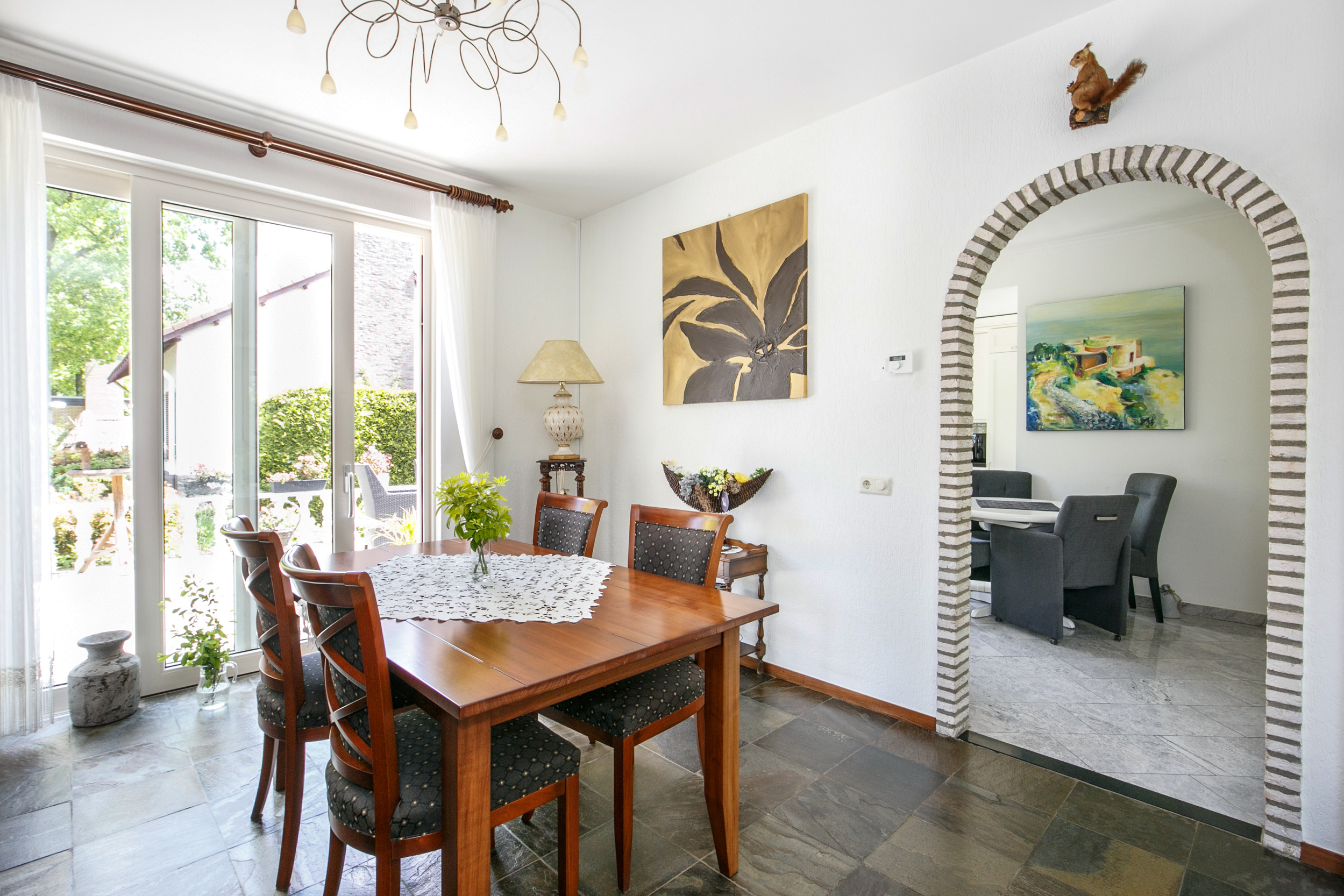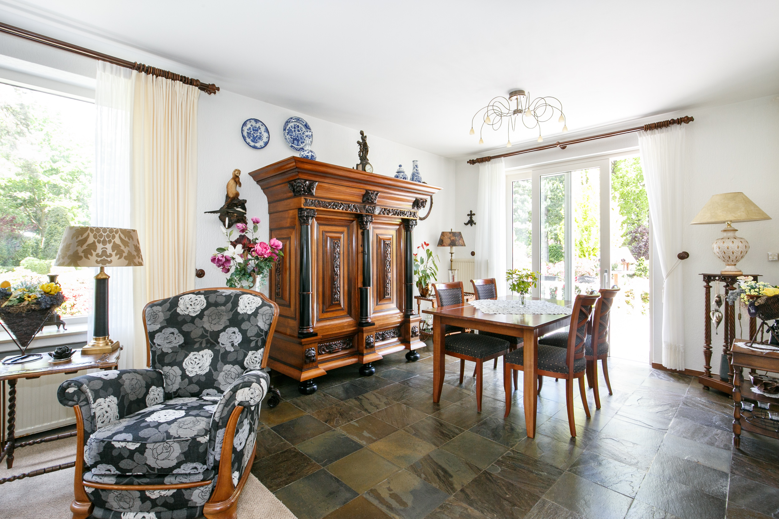 De lichte woonkamer (ca. 45 m²) is voorzien van een leisteen vloer, gestucte wanden en een gezellige gashaard. De grote schuifpui biedt toegang tot de tuin en zorgt voor een prachtig uitzicht op de groene omgeving.