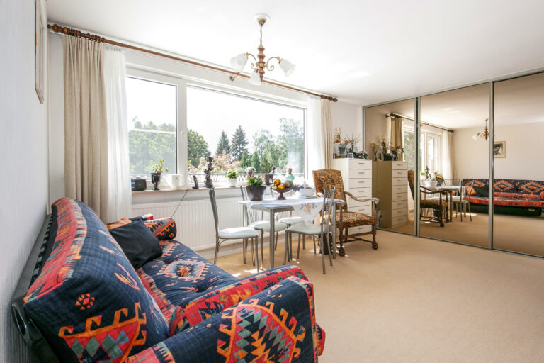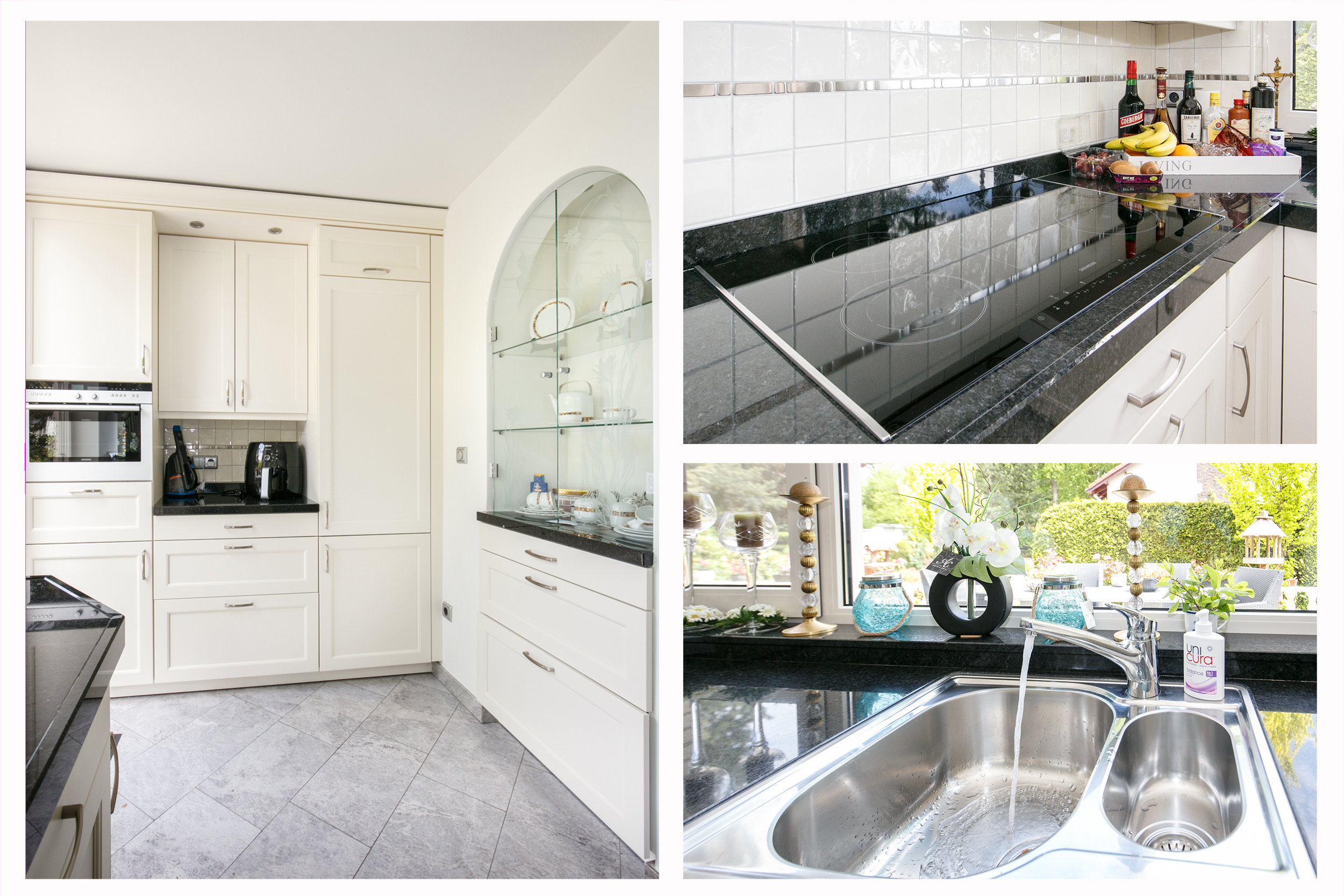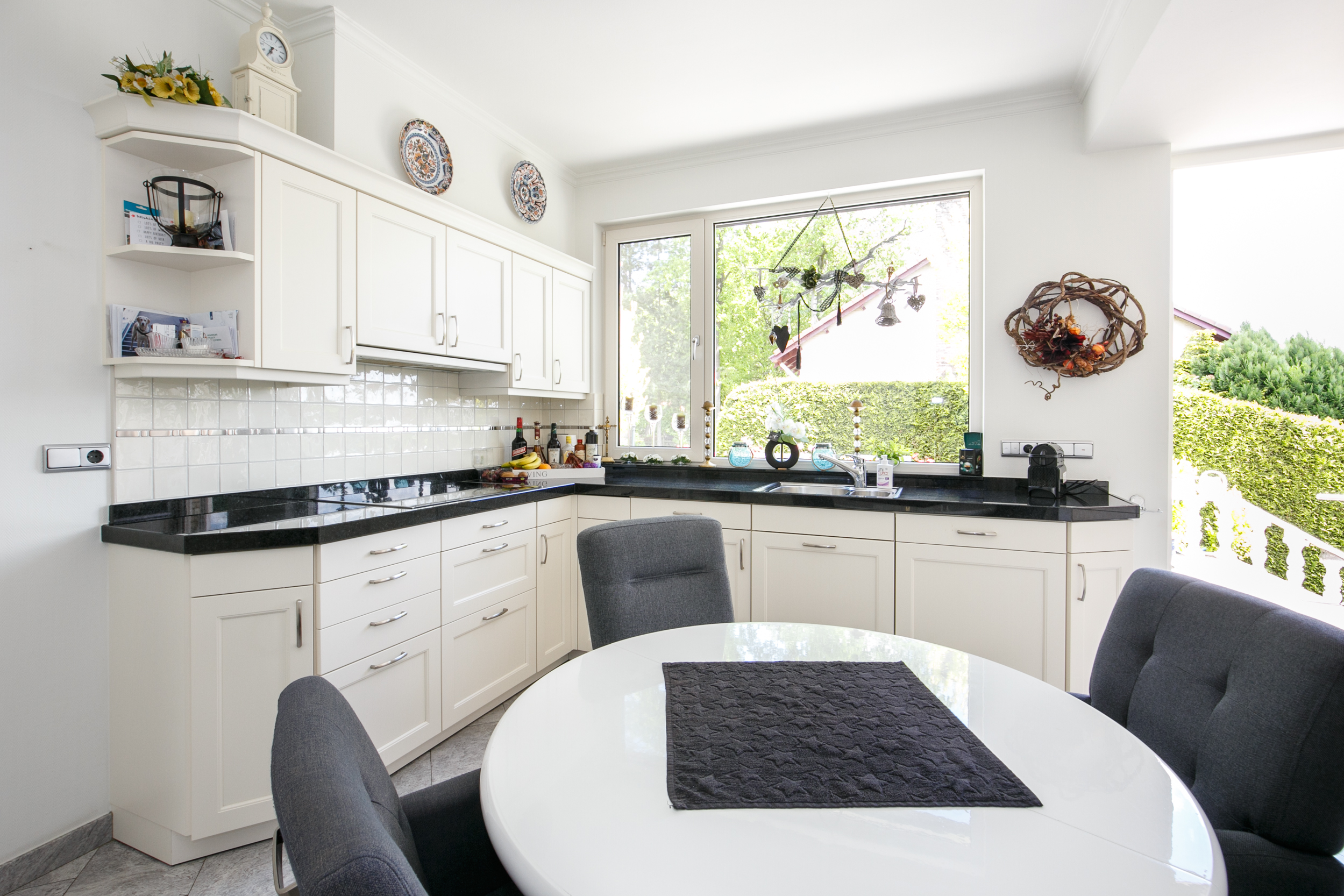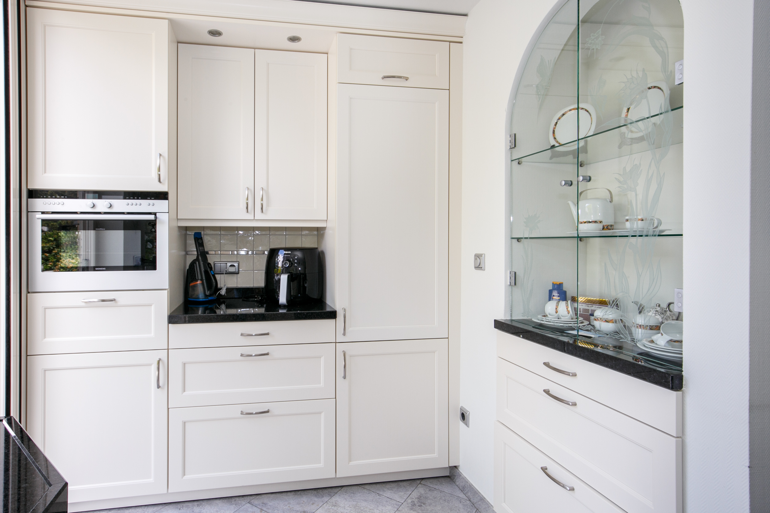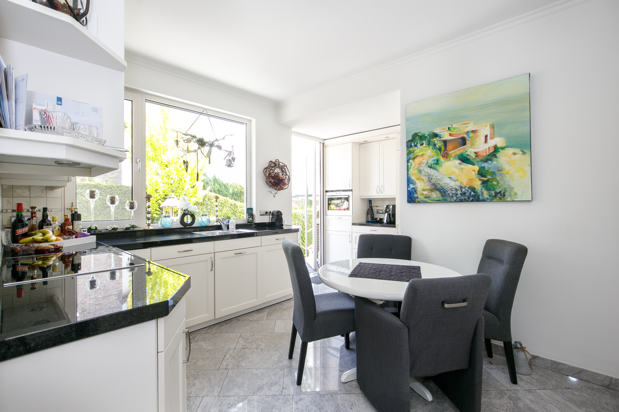 De keuken is voorzien van behaaglijke vloerverwarming en uitgerust met een luxe Siematic keukenopstelling voorzien van een zwart granieten aanrechtblad, inductiekookplaat, combi-oven/magnetron, koel-vriescombinatie, vaatwasser en afzuigkap. Via de loopdeur stap je zo het terras op – ideaal voor zomerse diners in de buitenlucht. S’ochtends kijk je vanuit het keukenraam op eekhoorntjes en vogels die vanuit het aangrenzende bos komen eten.