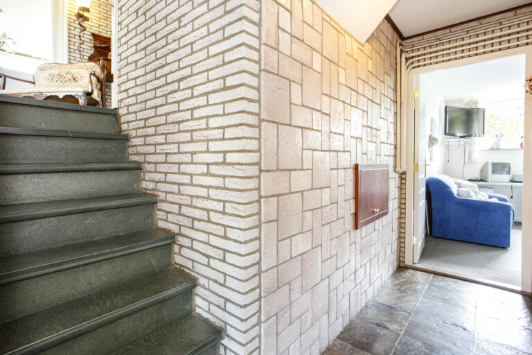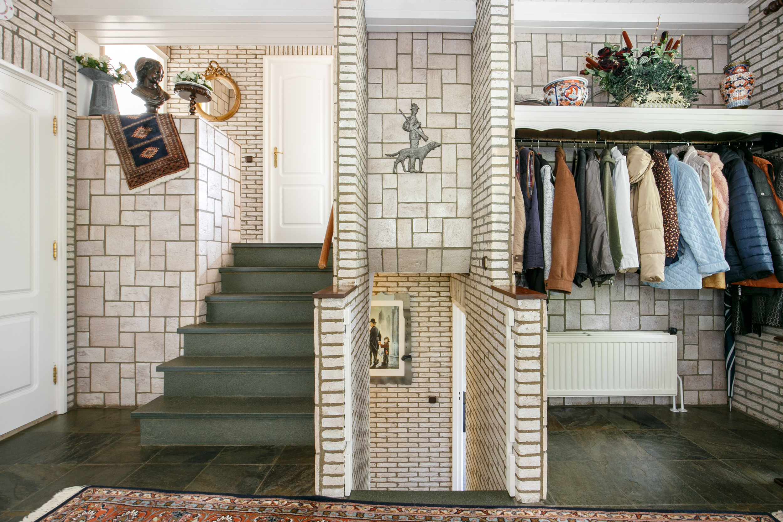 De sfeervolle hal met leisteen vloer en garderobe geeft toegang tot het toilet met fontein, de woonkamer en de keuken. Binnen enkele treden bereik je zowel het souterrain als de eerste verdieping.