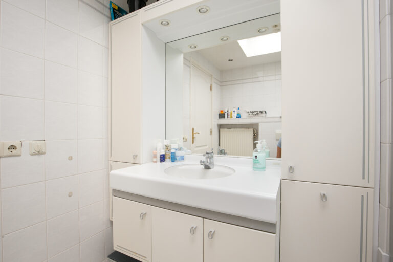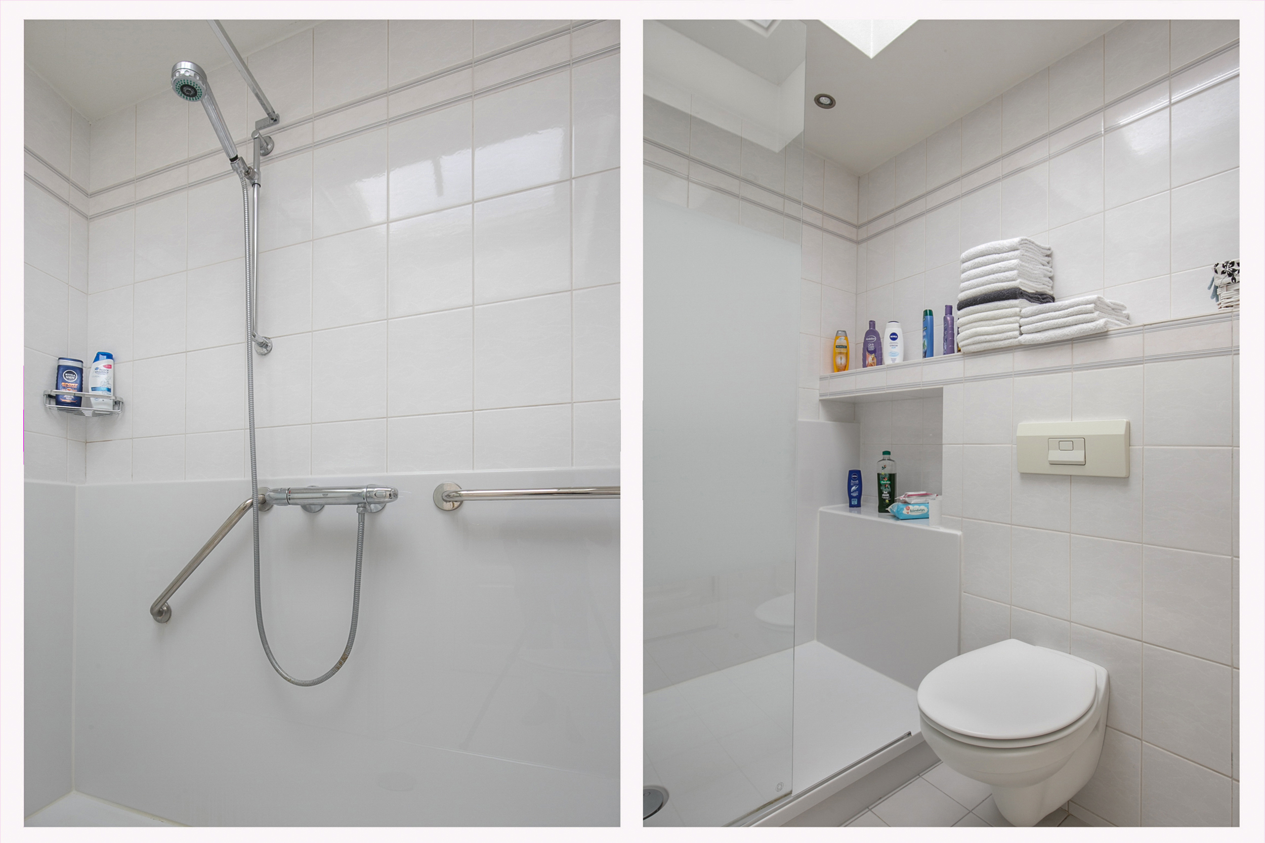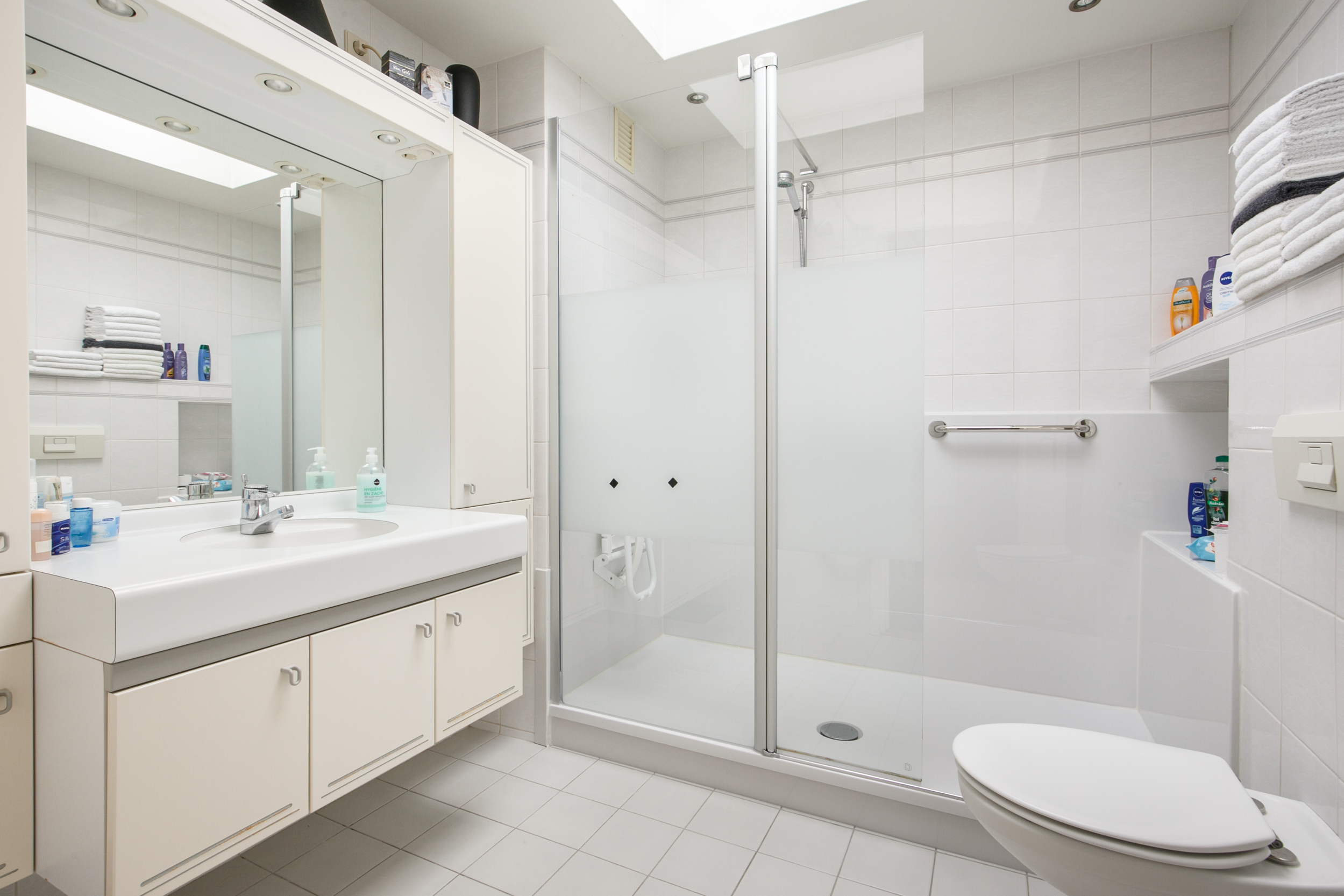 De volledig betegelde badkamer is voorzien van een wastafelmeubel, toilet, douche en een automatisch dakraam voor extra daglicht en natuurlijke ventilatie.
