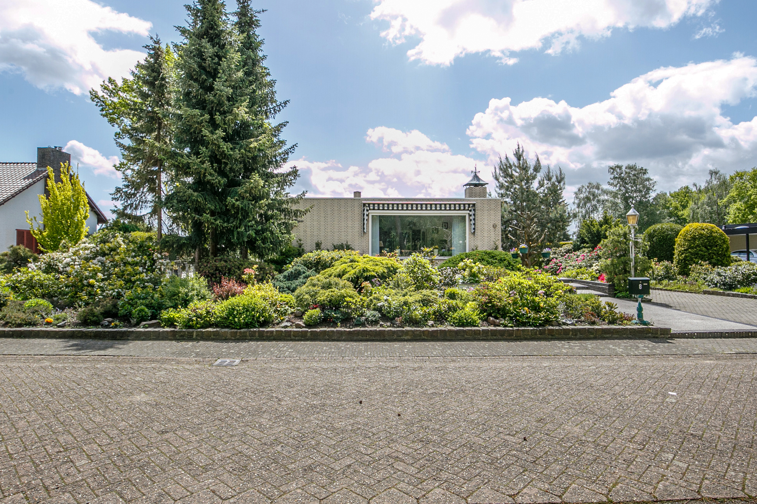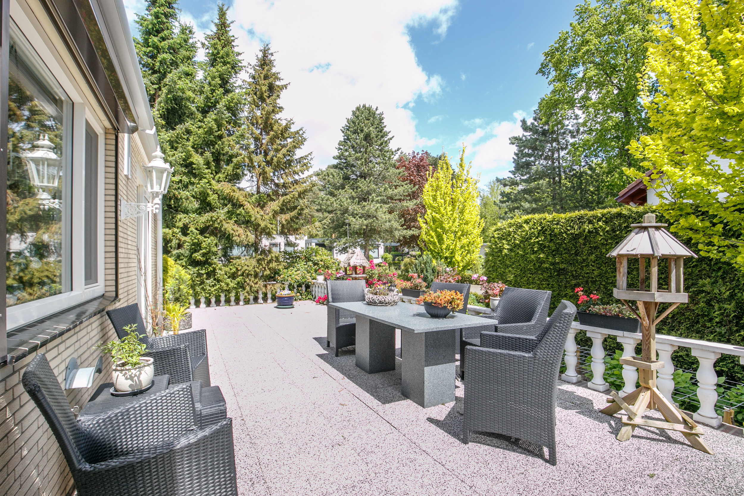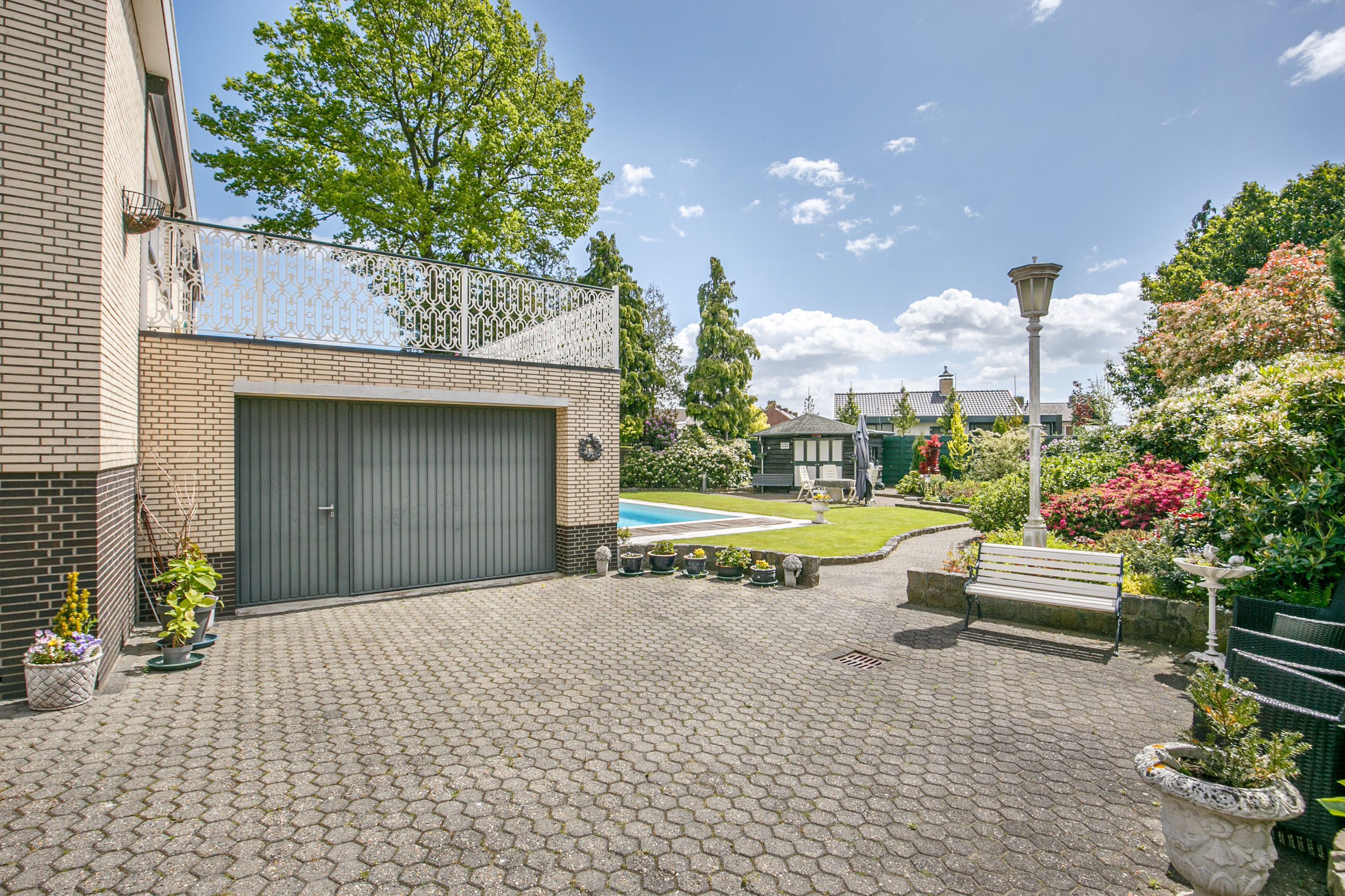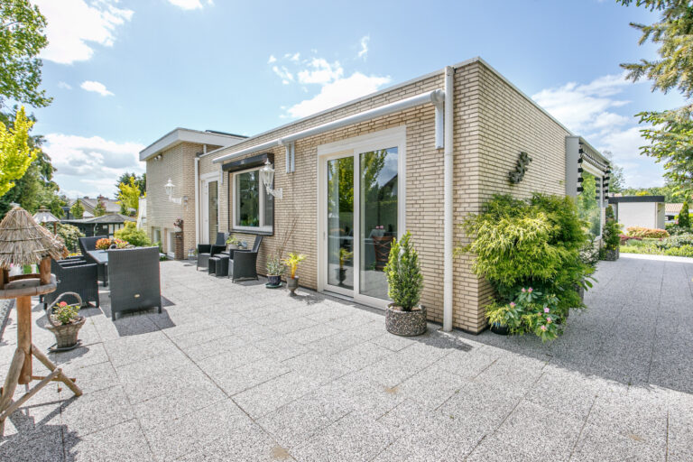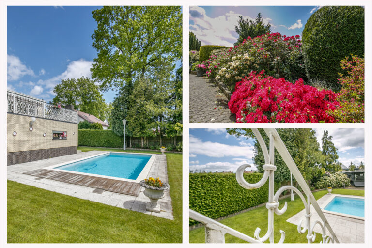 De fraai aangelegde tuin rondom de woning biedt volop privacy en ontspanning. Geniet van het zonneterras, het gemeubileerde tuinhuis en het zwembad. Aan de voorzijde bevindt zich een ruime oprit met plaats voor meerdere auto’s, omgeven door een groene voortuin.