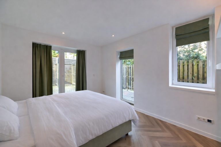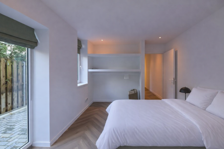 De 2 slaapkamers zijn ca. 8m² en 14m². De grote slaapkamer heeft een fijne lichtinval door de vele ramen en de openslaande deuren richting de tuin.