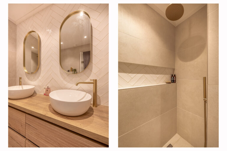 Beide badkamers zijn nieuw. Eén badkamer is voorzien van een douche, wastafelmeubel, toilet, designradiator en raam. De andere badkamer is en-suite bereikbaar via de hoofdslaapkamer en voorzien van een dubbele inloopdouche, een dubbel wastafelmeubel, toilet en designradiator.