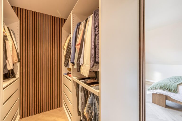 De slaapkamer is voorzien van een pvc-vloer en veel bergruimte. De moderne badkamer (ca. 5m²) is geheel betegeld en voorzien van een dubbele wastafel met meubel en inloopdouche. Een raam (met rolluik) zorgt voor daglicht en natuurlijke ventilatie.
