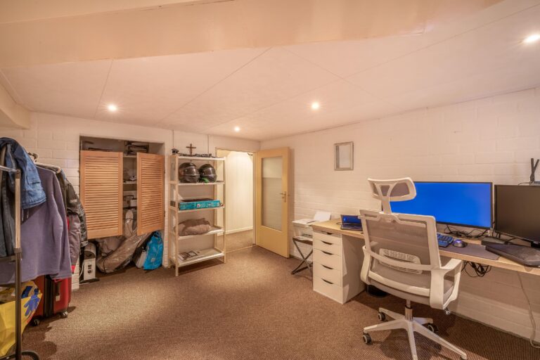 De grote achtertuin biedt alle ruimte om buiten te genieten. Onder de woning bevindt zich een drive-in garage/kelder, perfect voor het parkeren van de auto, extra opslag of een hobbyruimte.
