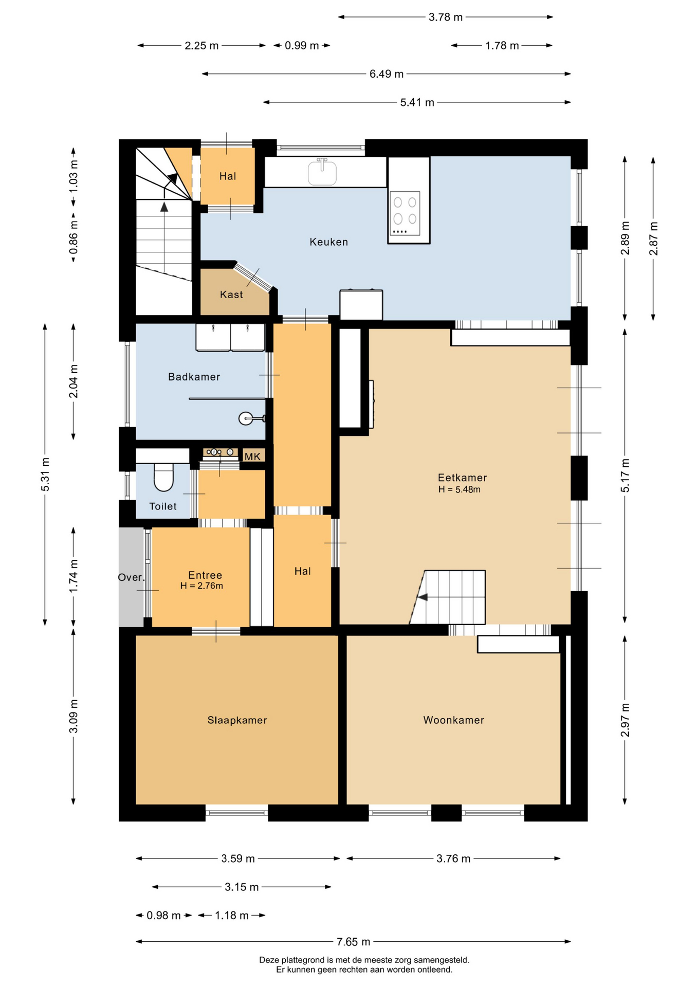 Vanuit de ruime hal zijn de slaapkamer, badkamer, woonkamer met zitkamer, keuken, het toilet en de meterkast bereikbaar. Op de begane grond ligt een tegelvloer.