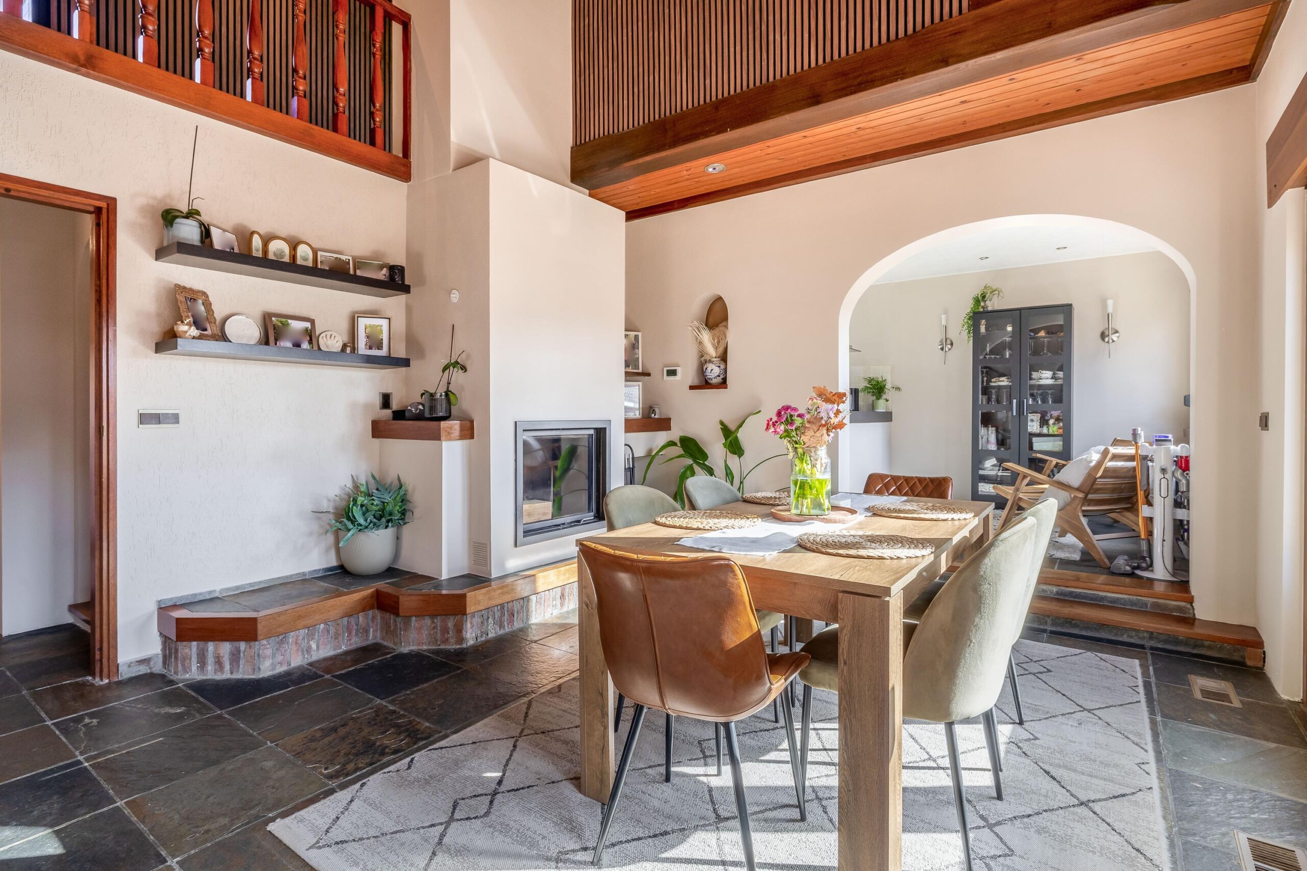 De woonkamer met aparte zitkamer is zeer ruim. De open trap met vide biedt toegang tot de eerste verdieping. De vele ramen en de openslaande deuren (2x) zorgen voor veel daglicht. Ten slotte is er een open haard aanwezig.