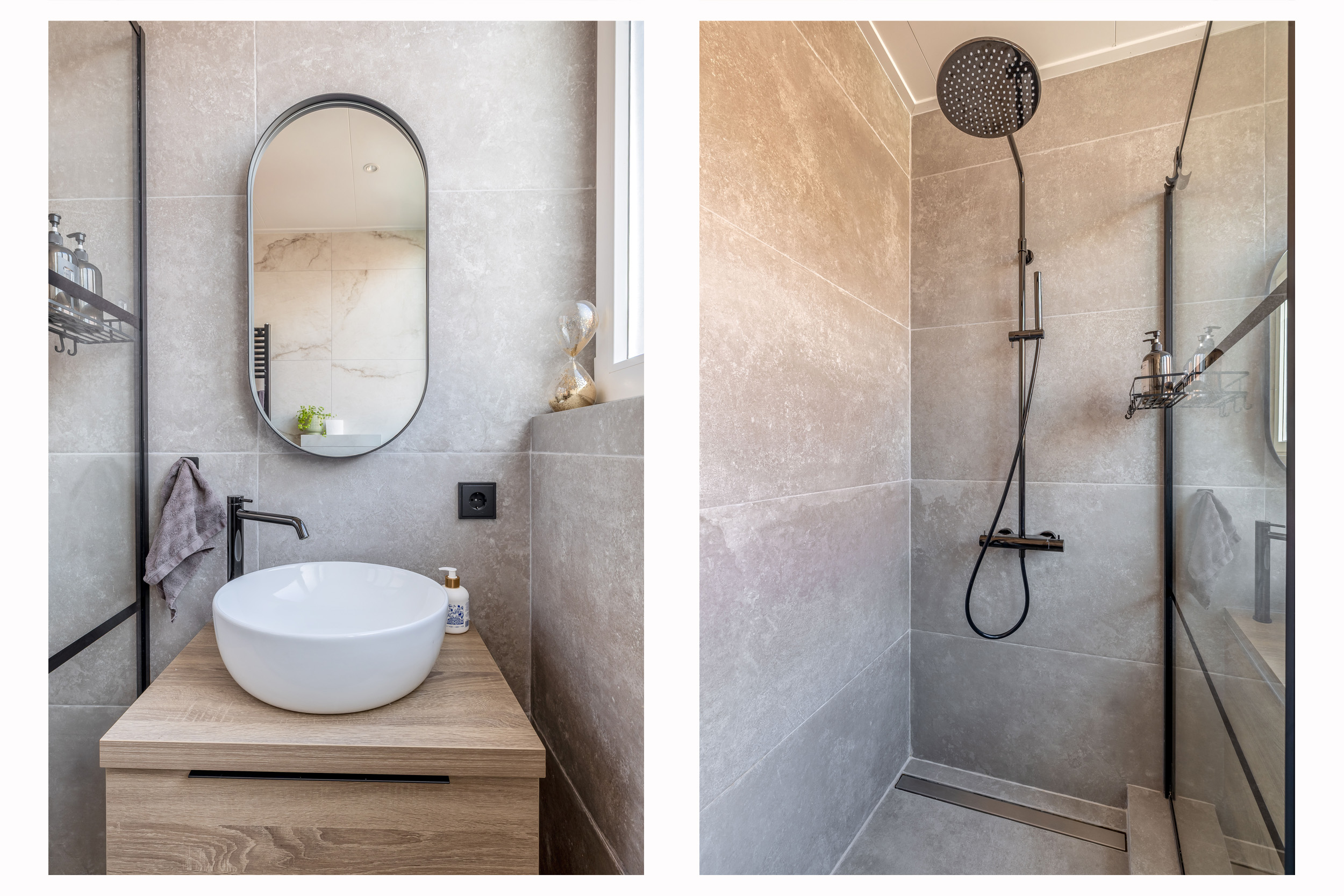 De slaapkamer is voorzien van een pvc-vloer en veel bergruimte. De moderne badkamer (ca. 5m²) is geheel betegeld en voorzien van een dubbele wastafel met meubel en inloopdouche. Een raam (met rolluik) zorgt voor daglicht en natuurlijke ventilatie.