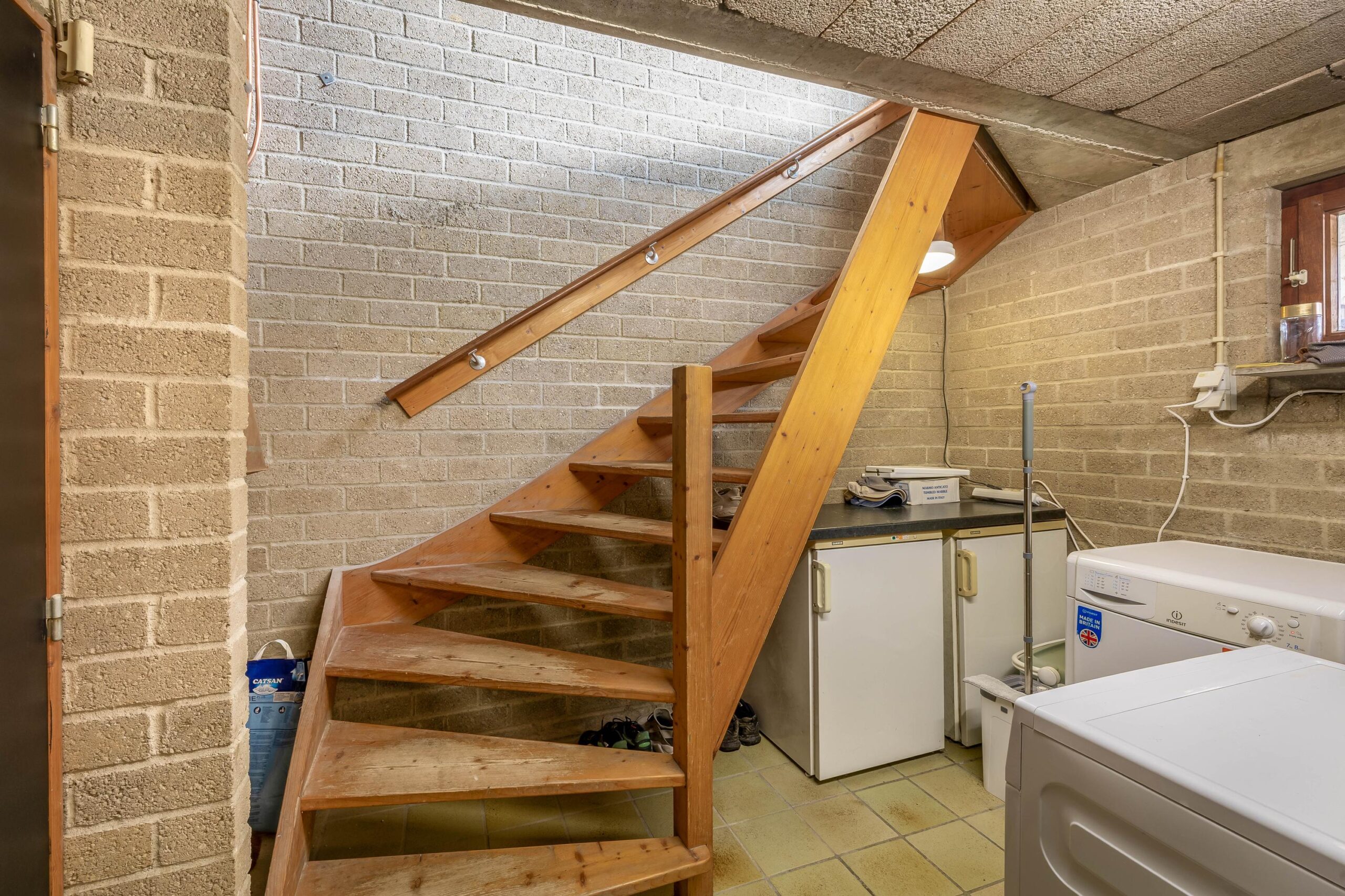 De grote achtertuin biedt alle ruimte om buiten te genieten. Onder de woning bevindt zich een drive-in garage/kelder, perfect voor het parkeren van de auto, extra opslag of een hobbyruimte.