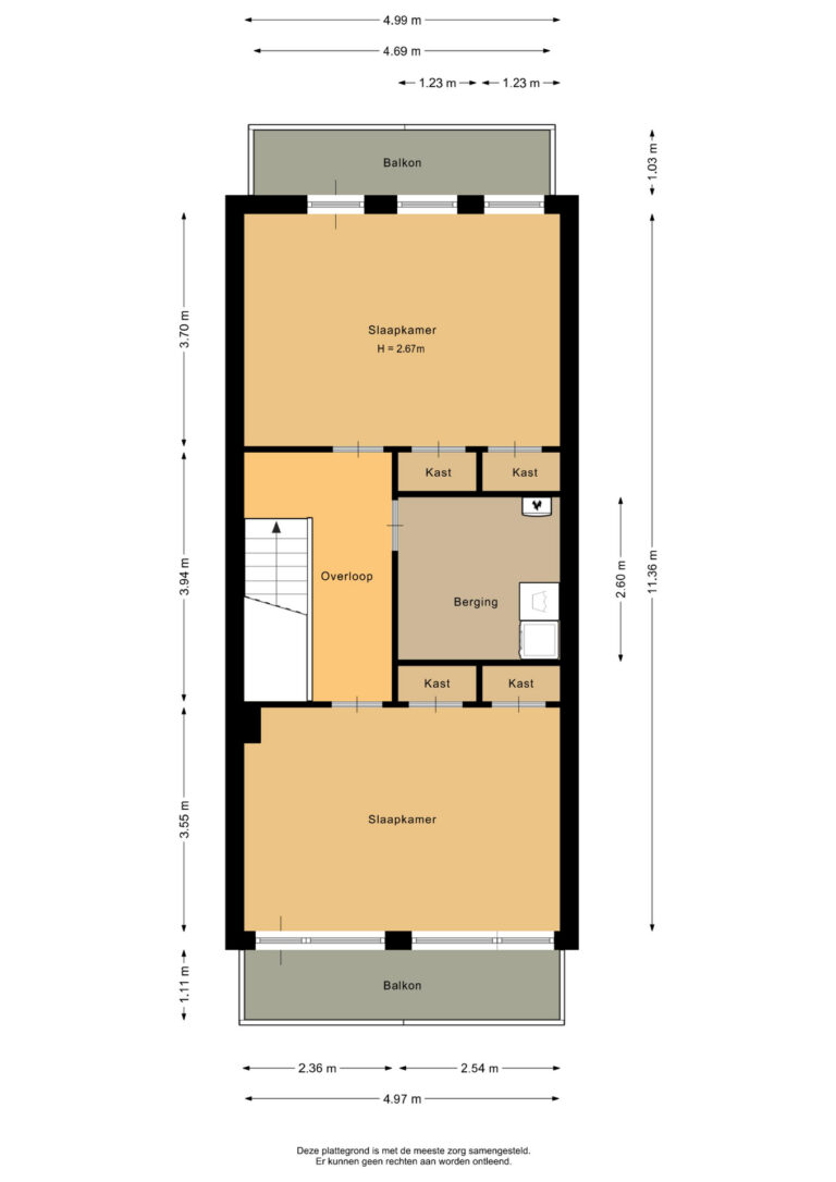 Beide slaapkamers (ca. 17,5m² en 18,5m²) zijn voorzien van een wastafel (koud water), twee muurkasten en een balkon. Een slaapkamer heeft vloerbedekking en de ander een laminaatvloer. De grote berging (ca. 6,5m²) is voorzien van een laminaatvloer en de cv-ketel.