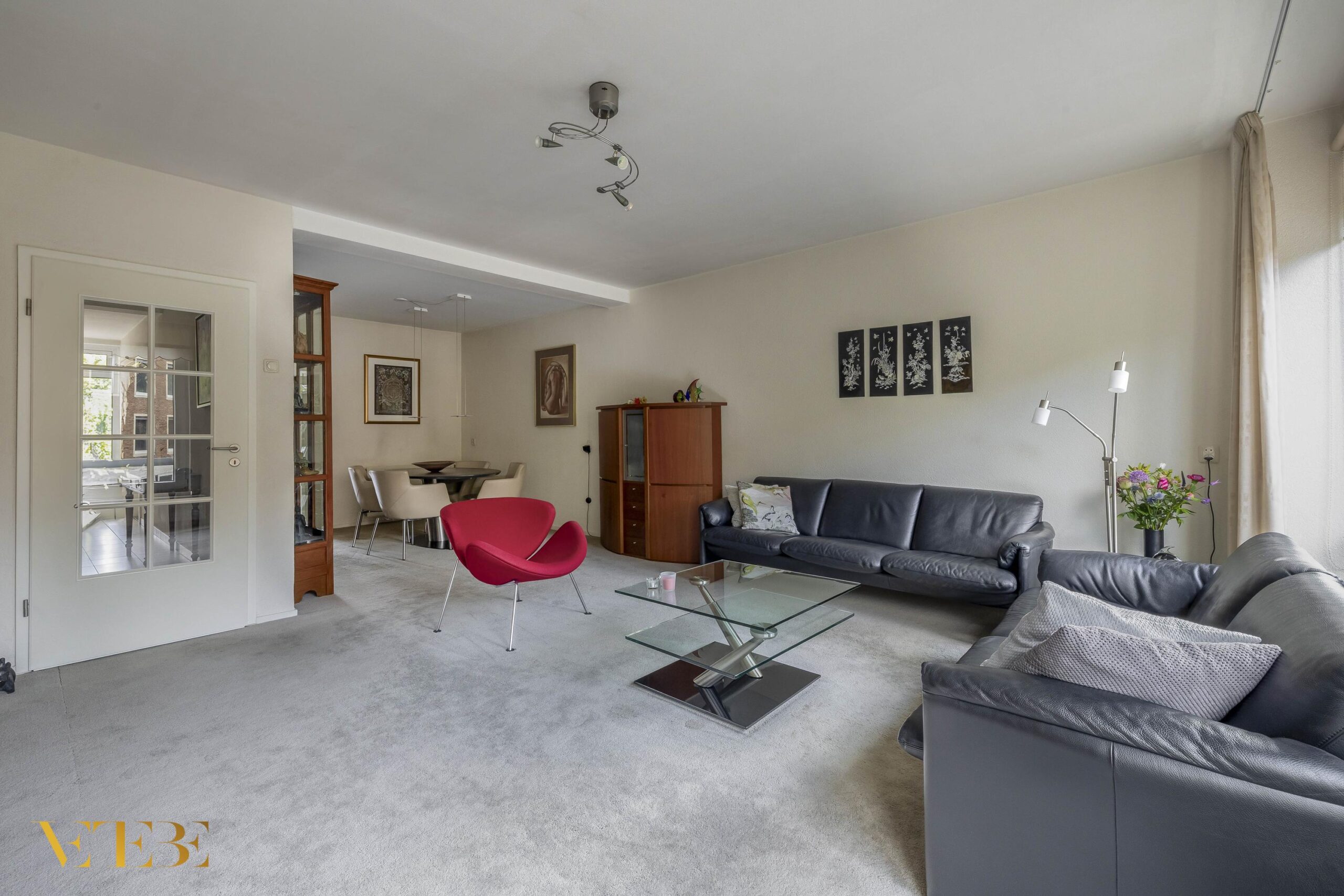 In de woonkamer (ca. 33m²) ligt vloerbedekking. Vanuit hier is er een mooi zicht op de binnenstad. Je geniet hier van een fijne lichtinval en voldoende ruimte.