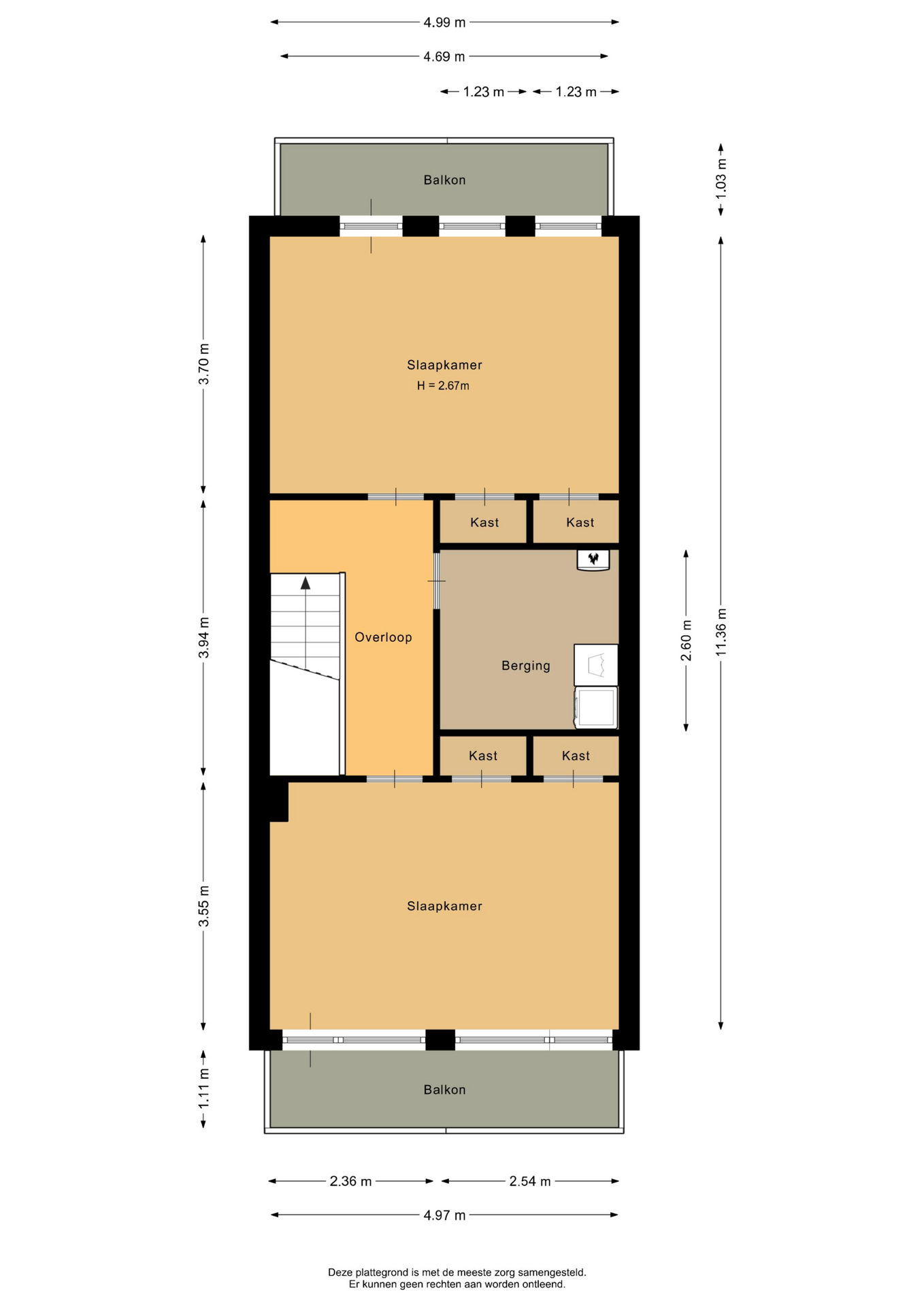 Beide slaapkamers (ca. 17,5m² en 18,5m²) zijn voorzien van een wastafel (koud water), twee muurkasten en een balkon. Een slaapkamer heeft vloerbedekking en de ander een laminaatvloer. De grote berging (ca. 6,5m²) is voorzien van een laminaatvloer en de cv-ketel.