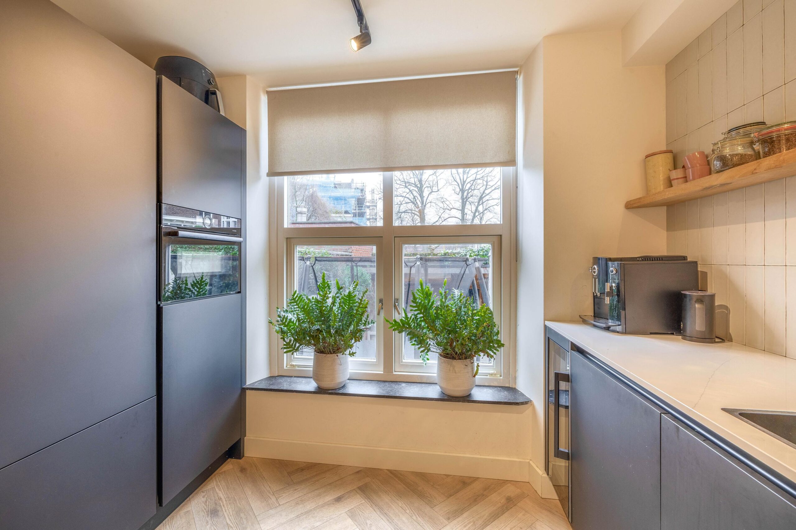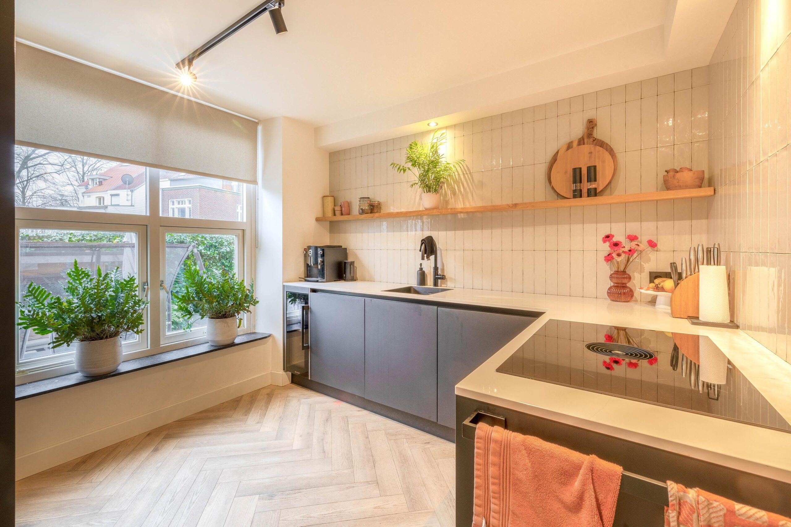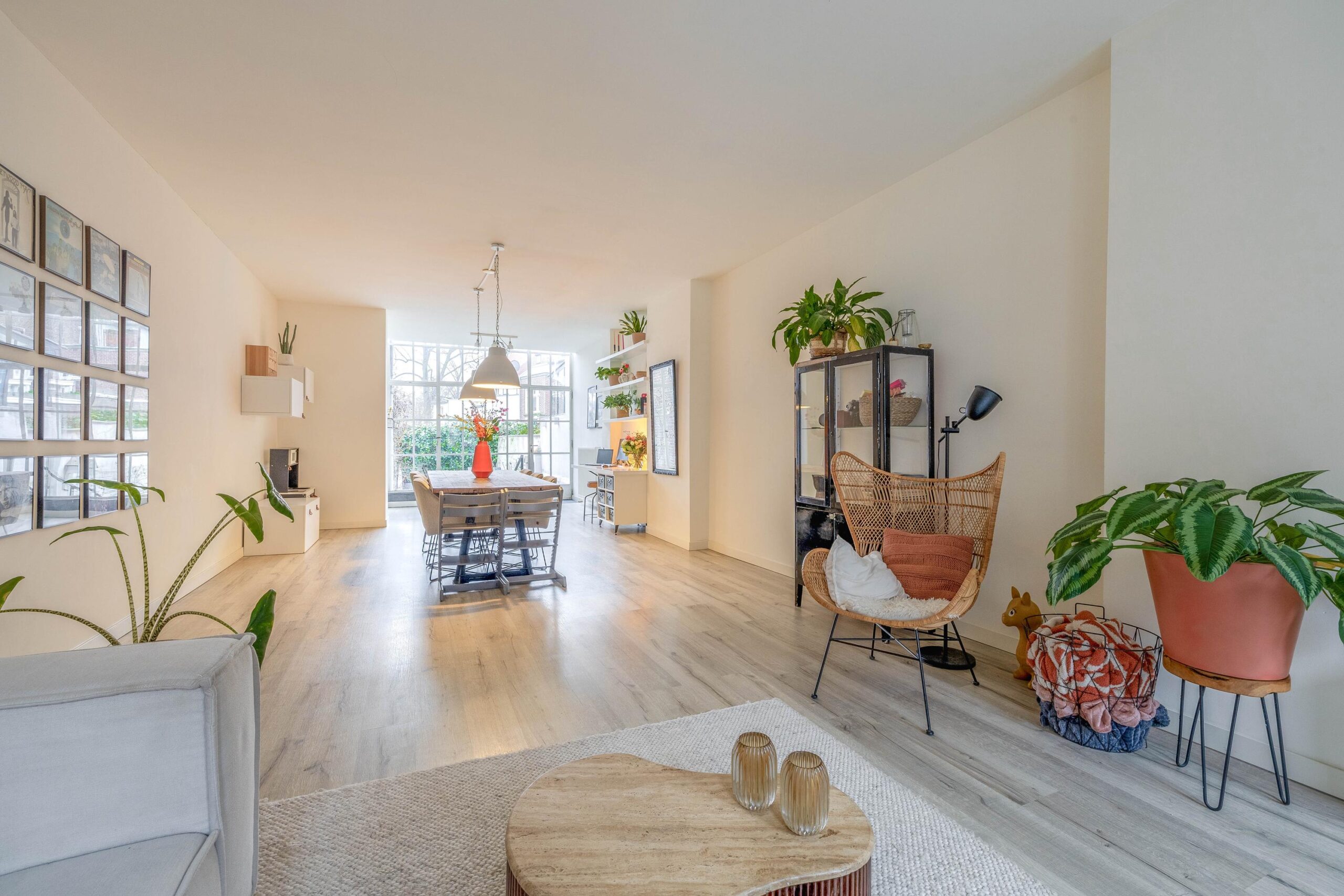 De royale woonkamer straalt luxe en ruimte uit dankzij de grote glazen pui die uitzicht biedt op je eigen stadstuin; een zeldzaamheid in de binnenstad. De keuken is helemaal van nu, volledig vernieuwd in 2023, en voorzien van elektrische vloerverwarming voor extra comfort.