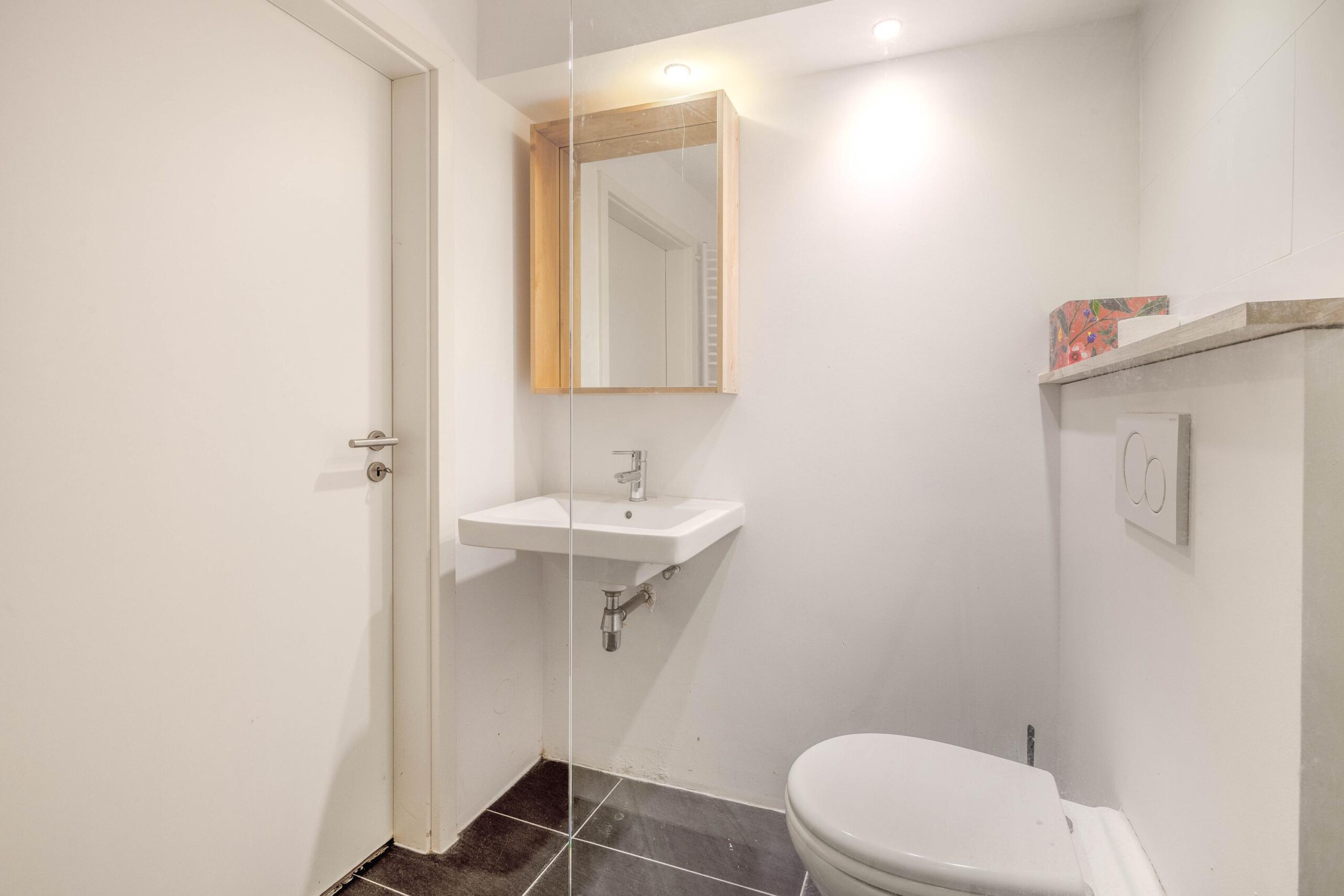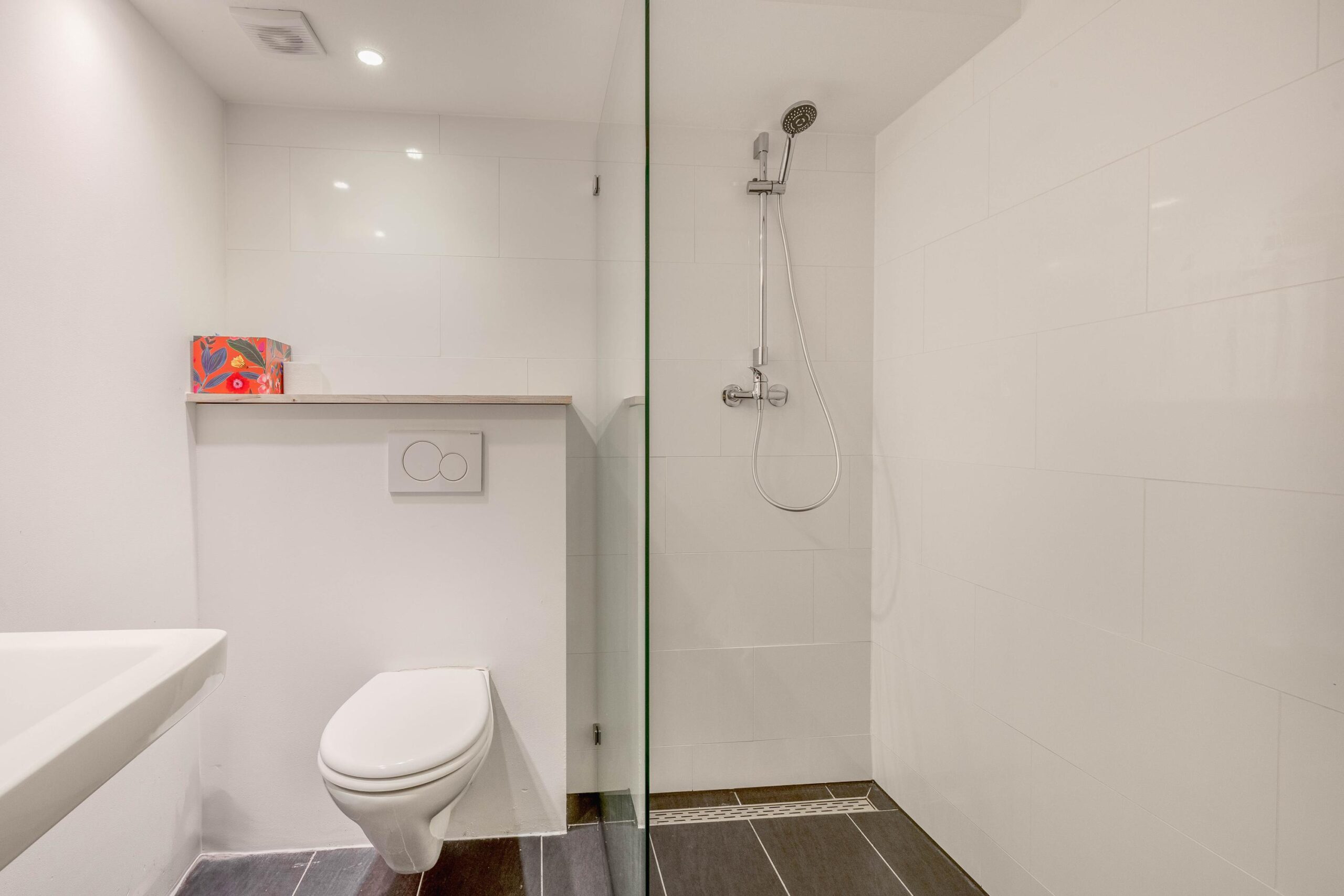 De 2de badkamer (ca. 4m²) is voorzien van een inloopdouche, wastafel, toilet en radiator. Deze badkamer is in december 2024 gerealiseerd.