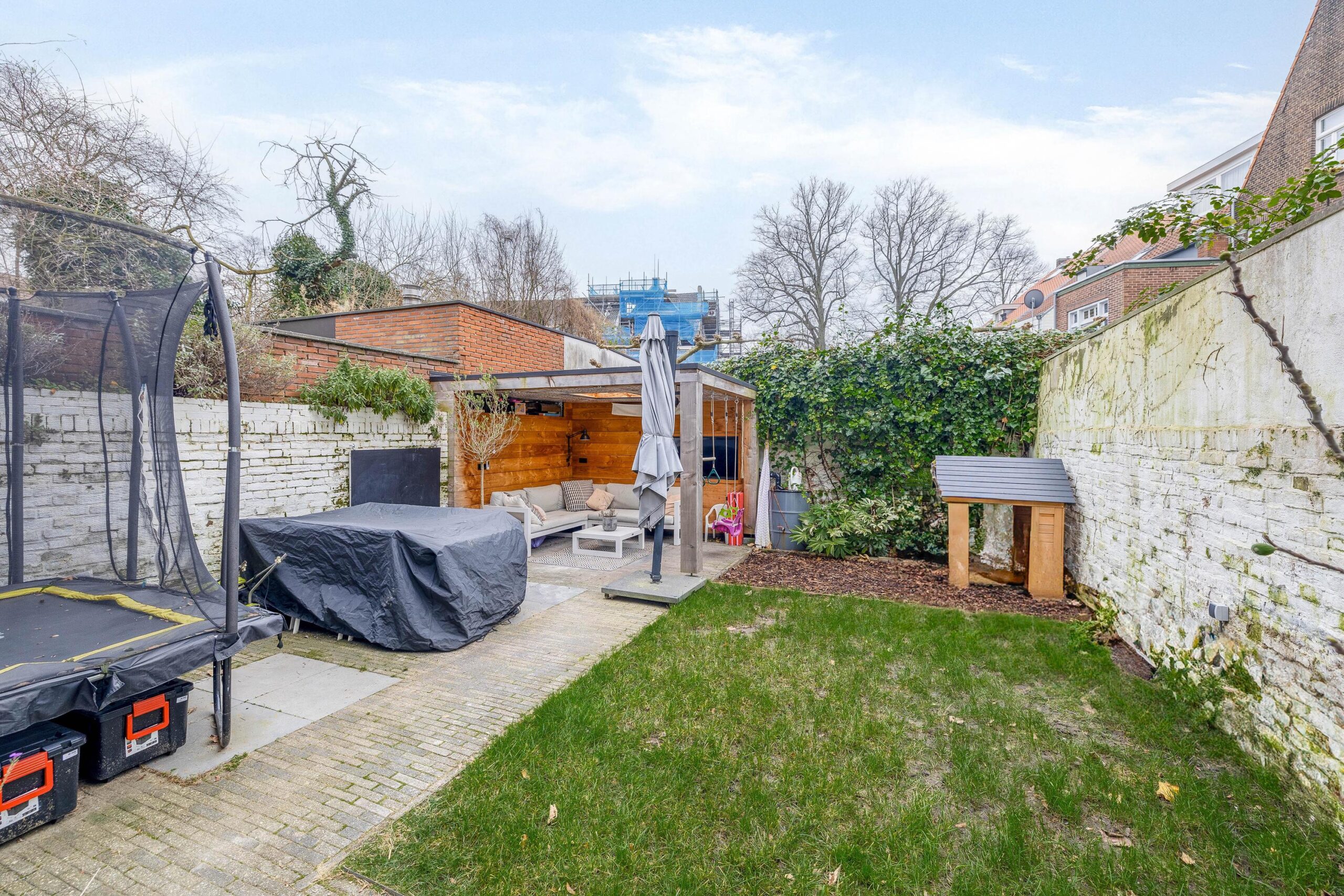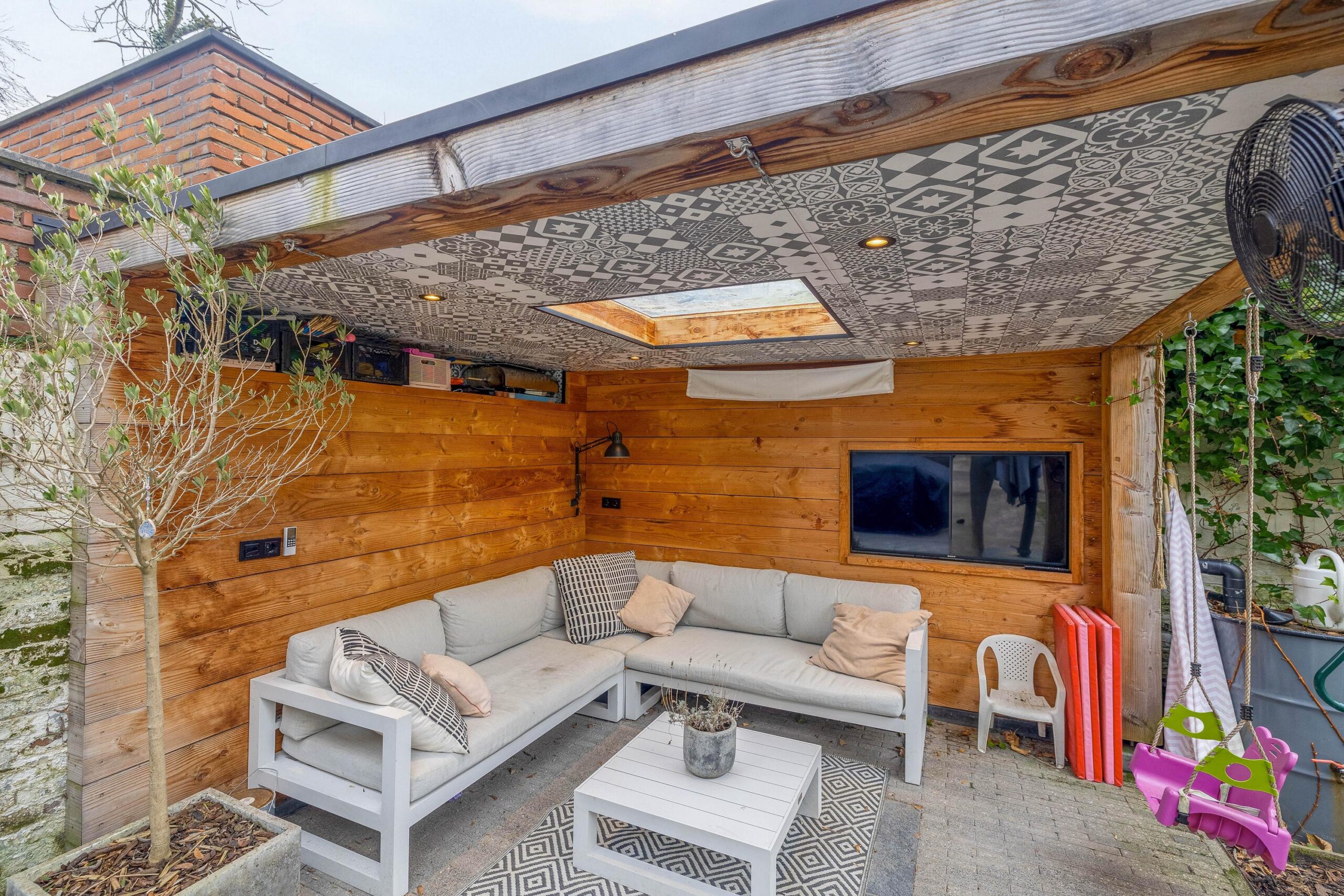 De geheel omheinde stadstuin is lekker ruim. Je geniet hier van veel privacy doordat er geen inkijk is. Achterin staat de houten overkapping. Hier zijn een lichtkoepel, internet en tv-aansluiting aanwezig.