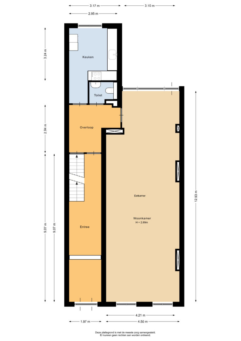 Via de gezamenlijke entree biedt de loopdeur toegang tot de hal vanuit waar de woonkamer, de keuken en het toilet bereikbaar zijn. Vanuit dezelfde hal is tevens het souterrain bereikbaar.