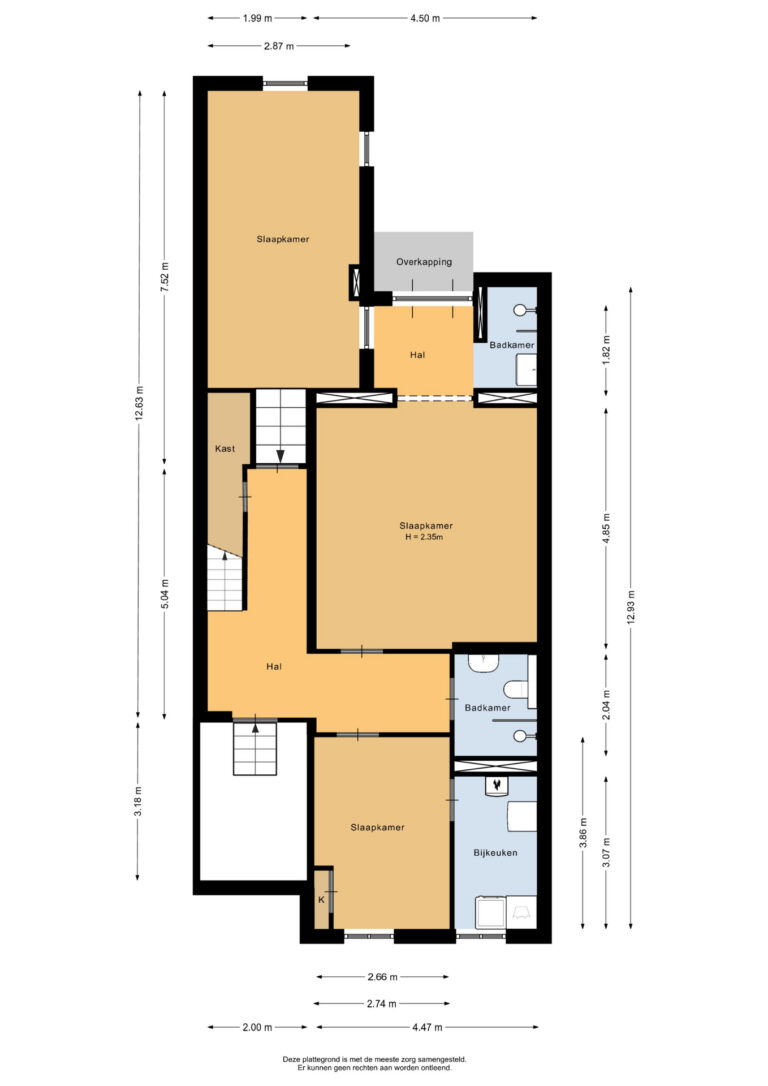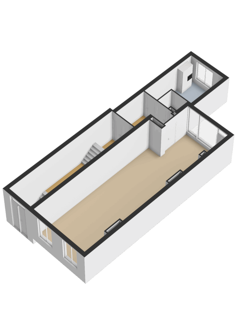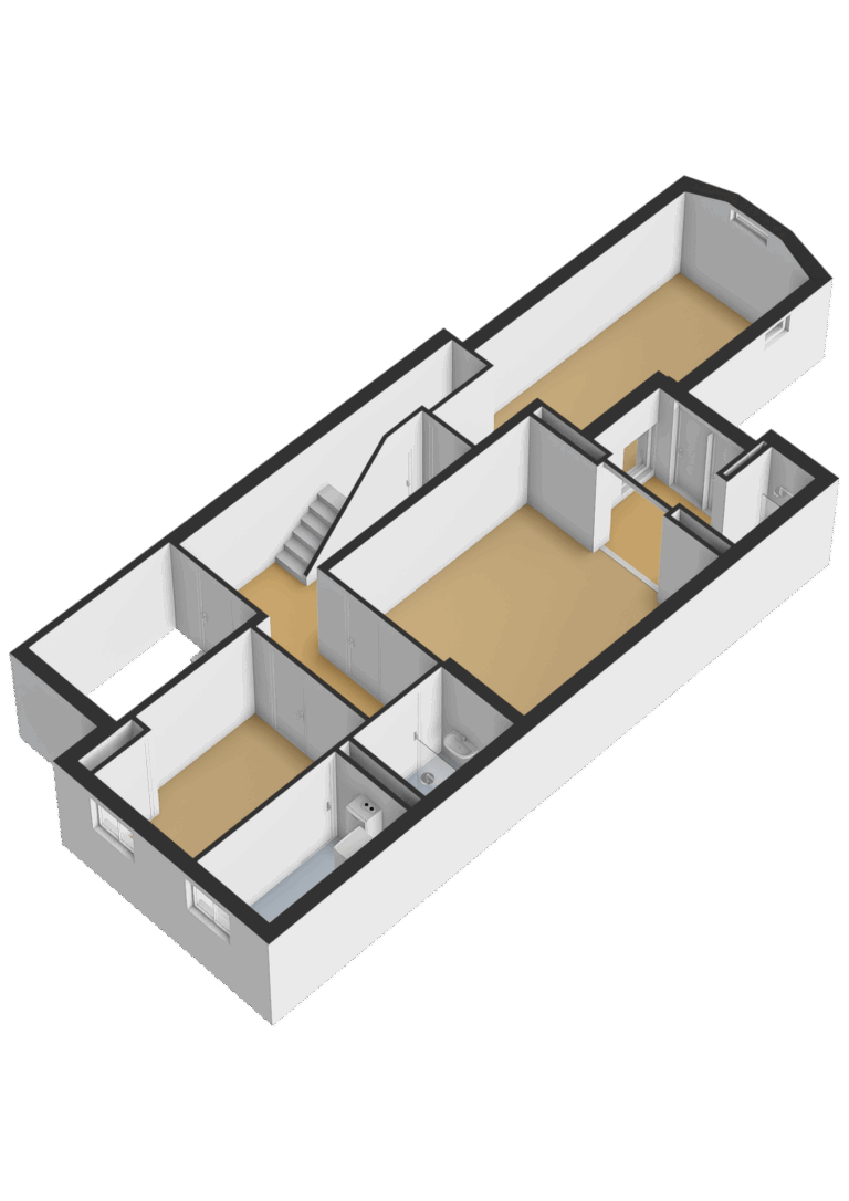 Het gehele souterrain is voorzien van een doorlopende laminaatvloer. Hier bevinden zich de 3 slaapkamers, 2 badkamers en de bijkeuken/stookruimte.