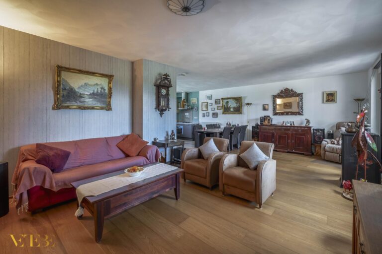 De hal is zeer ruim. Wat direct opvalt is de zeer grote woonkamer met open keuken (totaal ca. 47m²). Het is een zeer grote ruimte met een houten vloer. In de woonkamer zijn een pelletkachel en airco aanwezig. De keuken is uitgerust met een 4-pits gasfornuis met wokbrander, een oven, afzuigkap en vaatwasser.