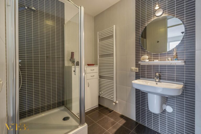 In de badkamer (ca. 4m²) zijn een douche, wastafel en designradiator aanwezig. Er ligt een tegelvloer. De slaapkamer (ca. 17m²) is voorzien van een laminaatvloer en biedt direct tuinzicht.
