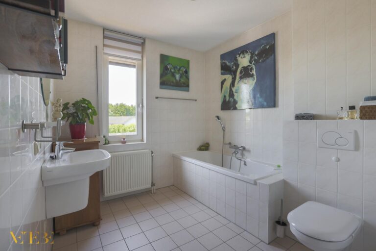 In de geheel betegelde badkamer (ca. 7m²) zijn een ligbad met douche, wastafel en toilet aanwezig. Het raam zorgt voor daglicht en tevens natuurlijke ventilatie.