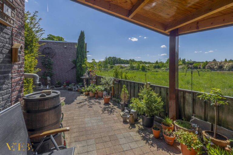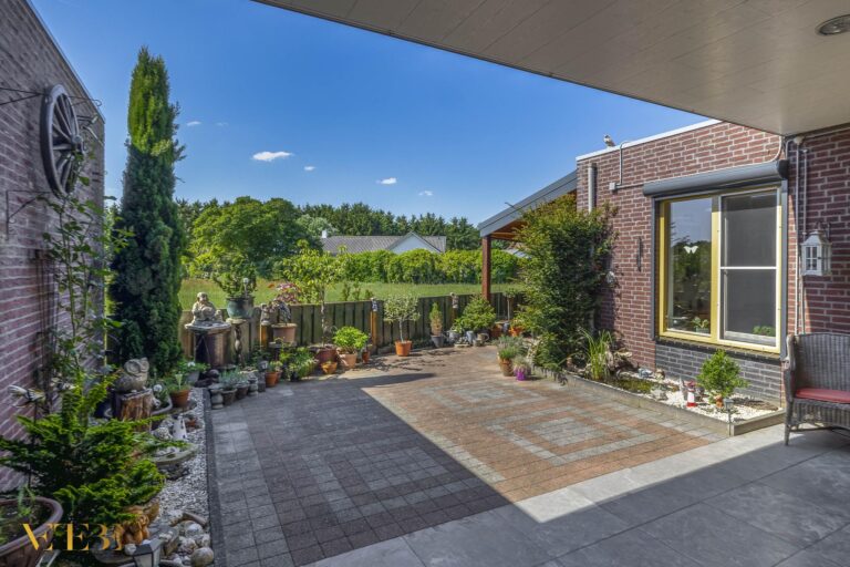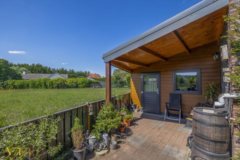 De omheinde, nagenoeg onderhoudsvrije, achtertuin biedt een mooi, vrij uitzicht op de groene weide. Aan de woning bevindt zich een grote overkapping (ca. 22m²) met 2 lichtkoepels, verlichting en muziekboxen.