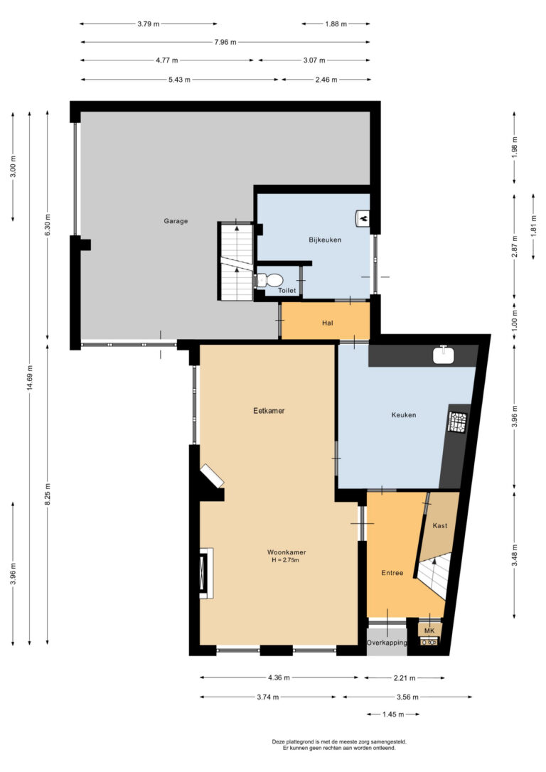 De zeer grote garage/hobbyruimte (ca. 35m²) kan eventueel omgetoverd worden tot een royale en mooie tuinkamer met openslaande deuren of een schuifpui richting de achtertuin. Een loopdeur biedt toegang tot de oprit. Tevens is de kelder vanuit hier bereikbaar.