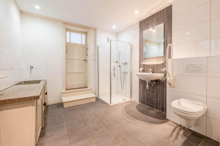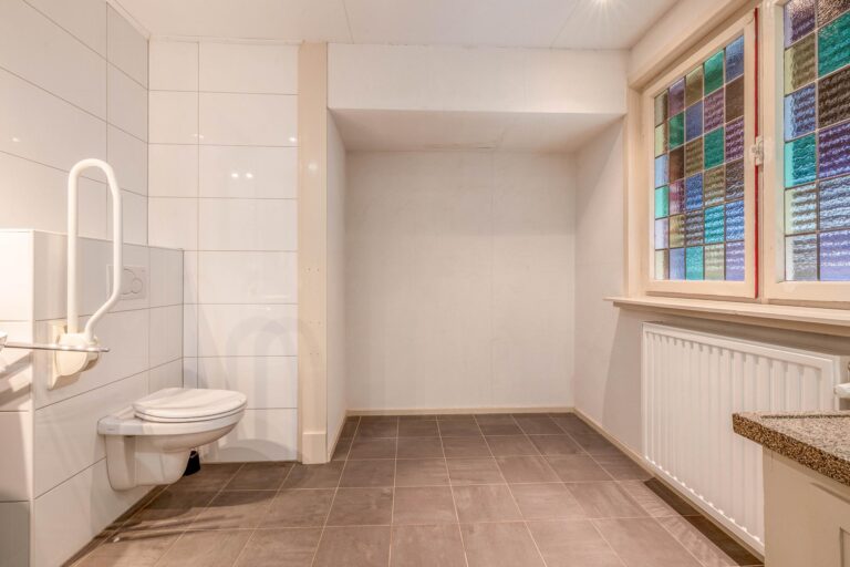 Alle slaapkamers zijn voorzien van mooie glas-in-lood ramen. Ook de badkamer heeft glas-in-lood ramen. De badkamer (ca. 10m²) is geheel betegeld en voorzien van een douche, toilet, wastafel en wastafelmeubel. Vanuit hier is het eventueel mogelijk door te breken naar de zolder boven de garage/hobbyruimte.