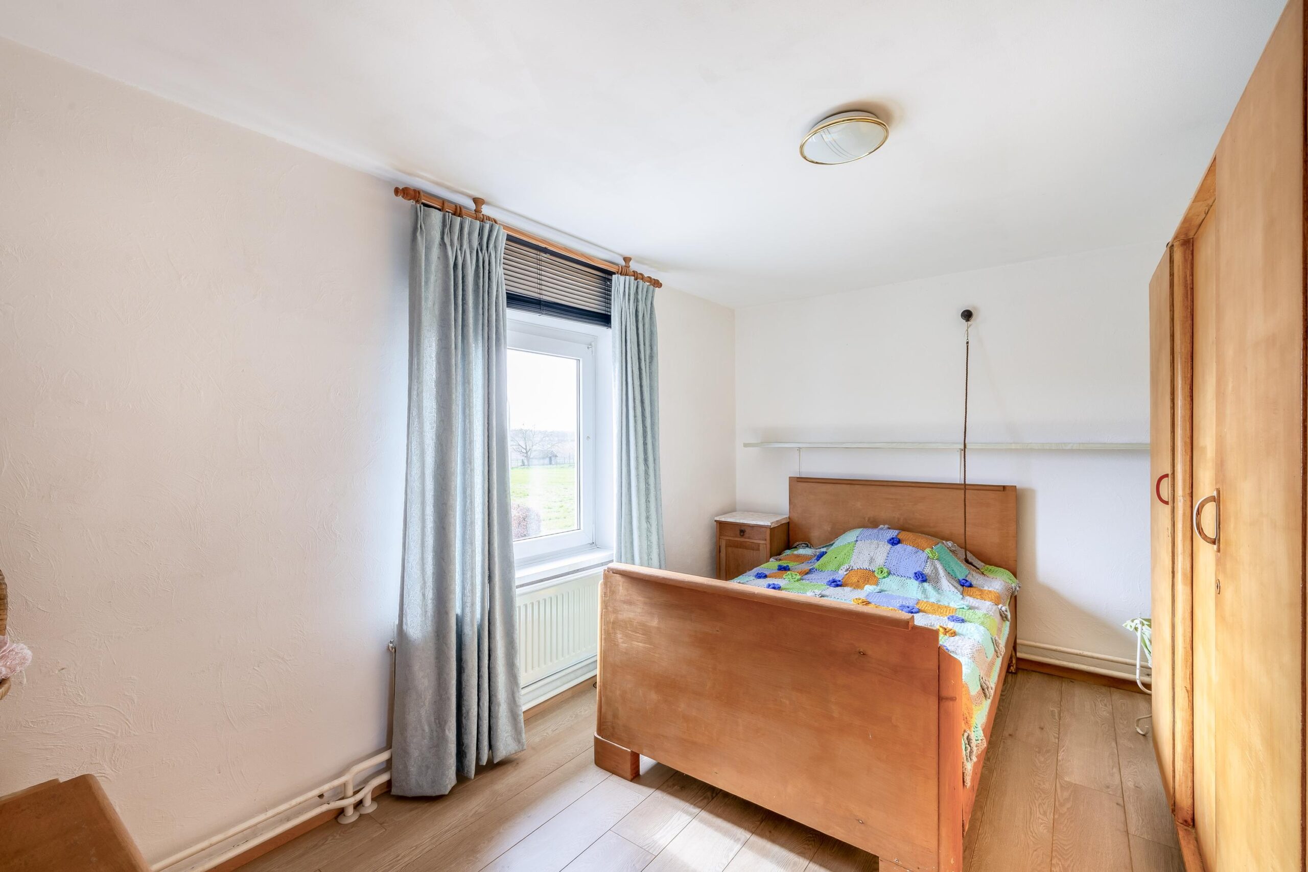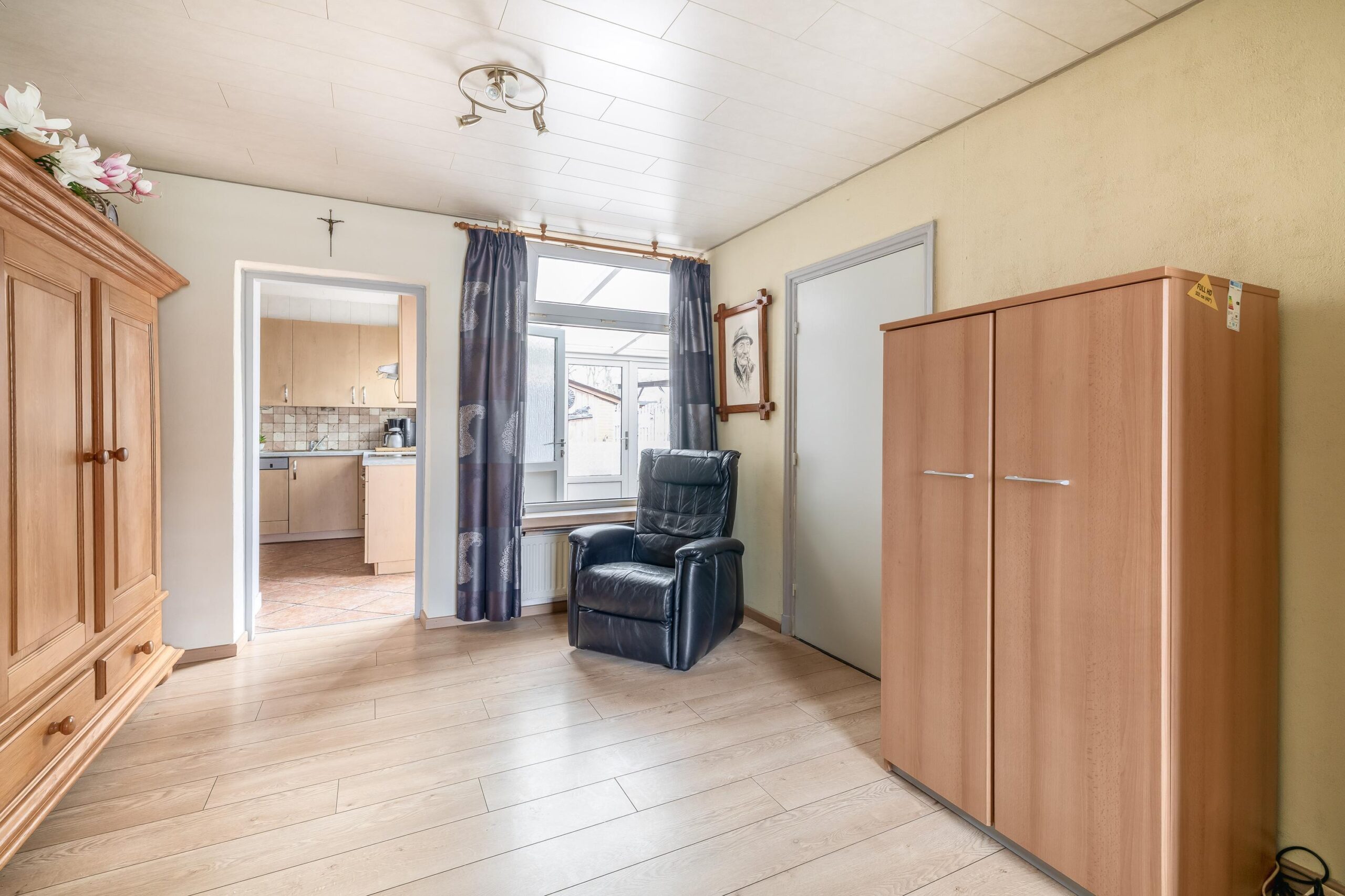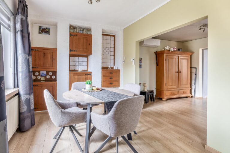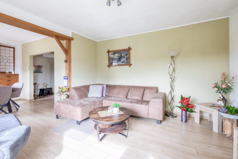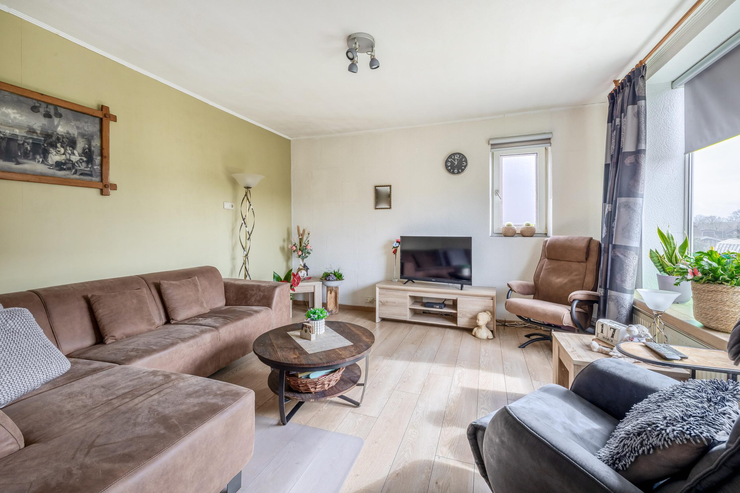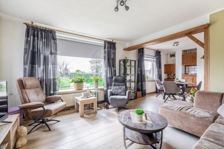Vanuit de hal is de L-vormige woonkamer bereikbaar. Hier hangt een airco en er ligt een laminaatvloer. Aan de voorzijde is er vrij uitzicht over de groene velden.