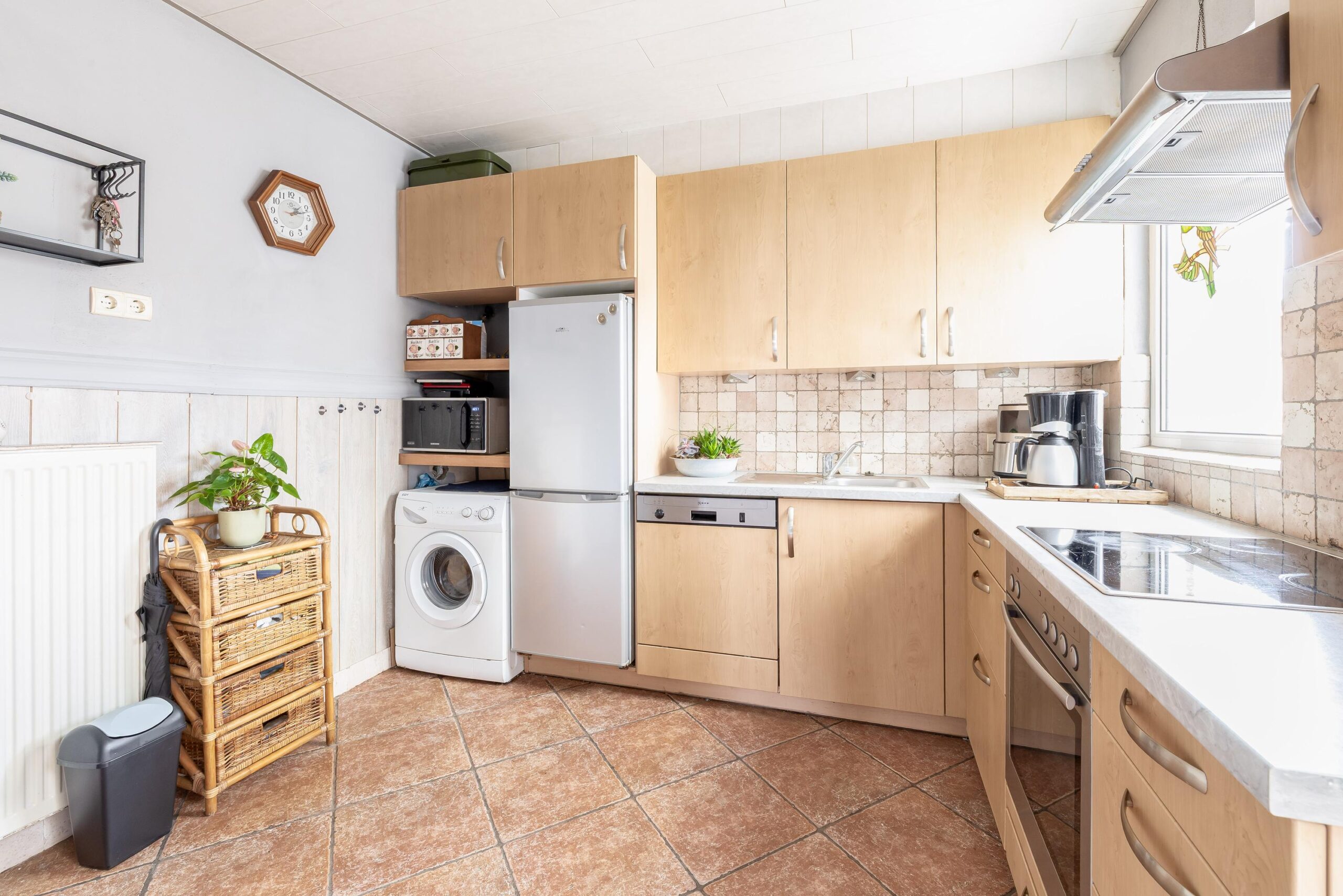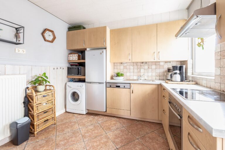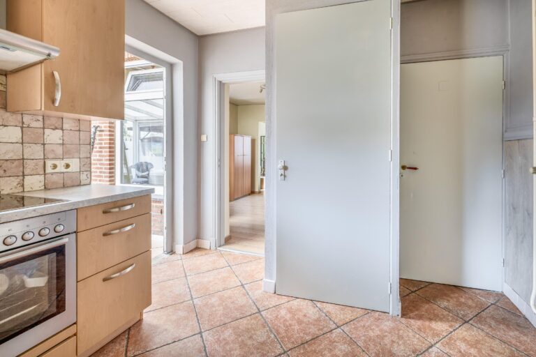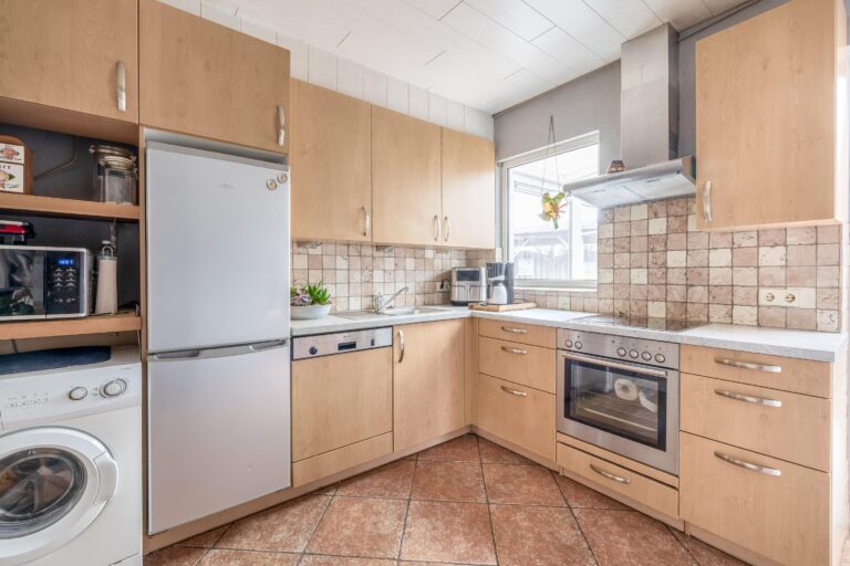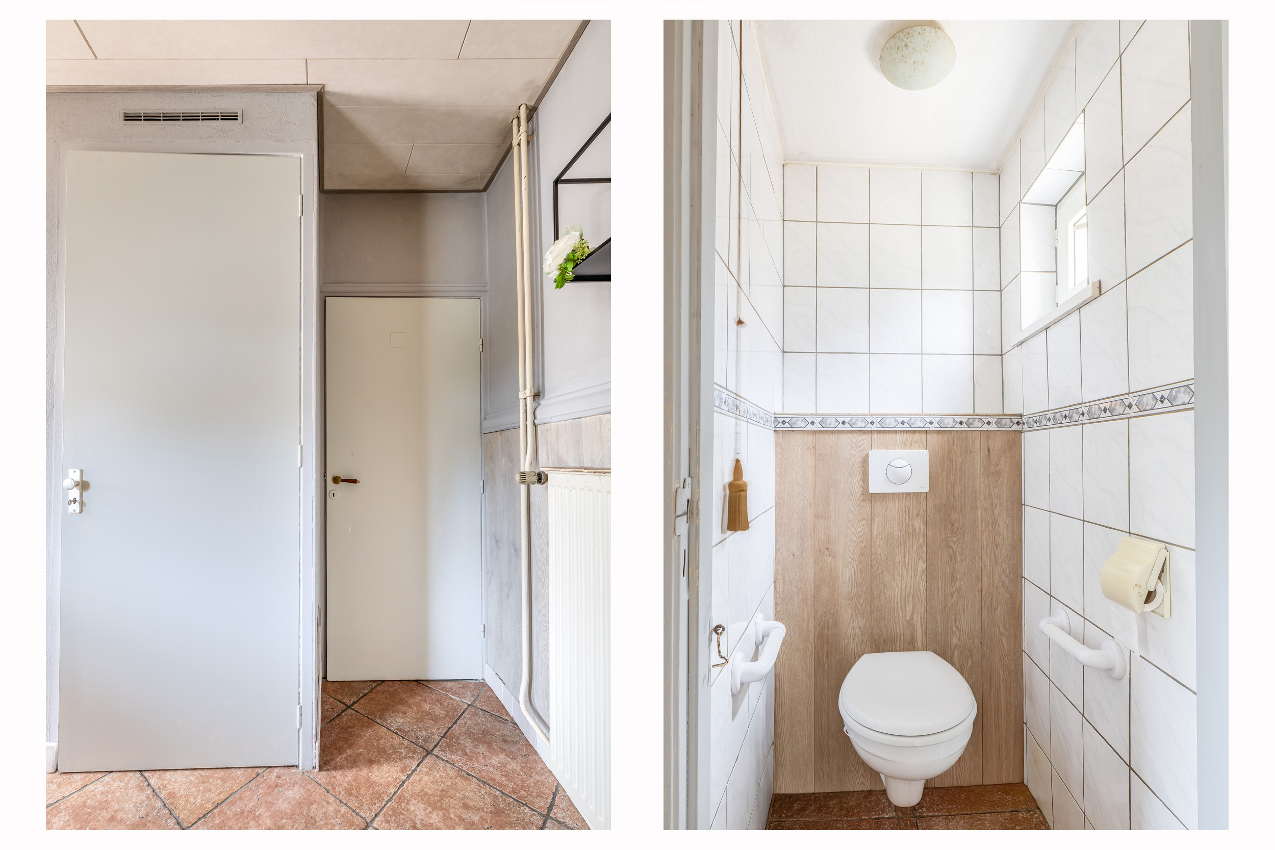 In de dichte keuken zijn een inductiekookplaat, afzuigkap, oven en vaatwasser aanwezig. Tevens bevindt zich hier de witgoedaansluiting en de muurkast met de cv-ketel. Er ligt een tegelvloer. Het toilet is voorzien van een klein raam.