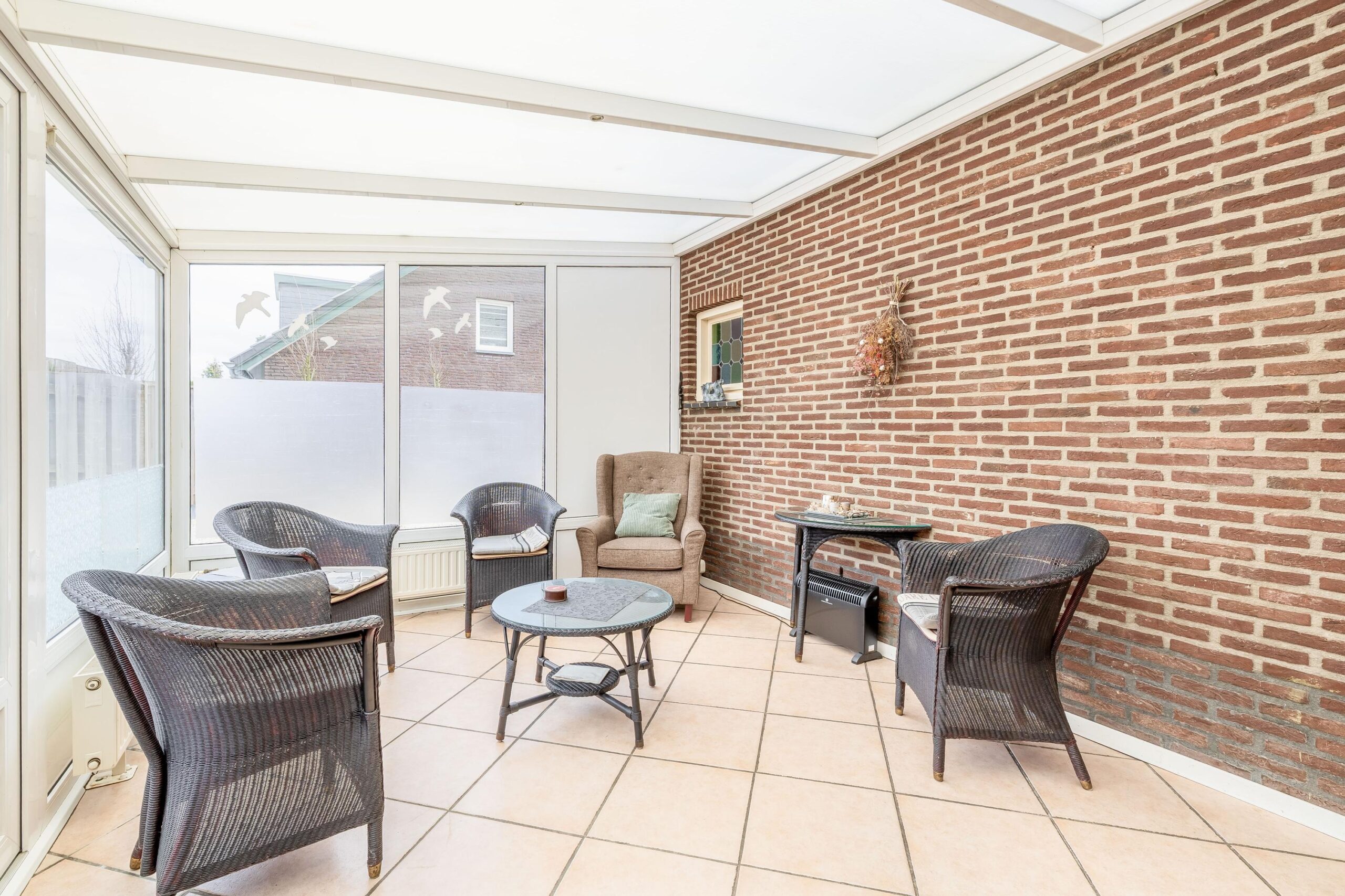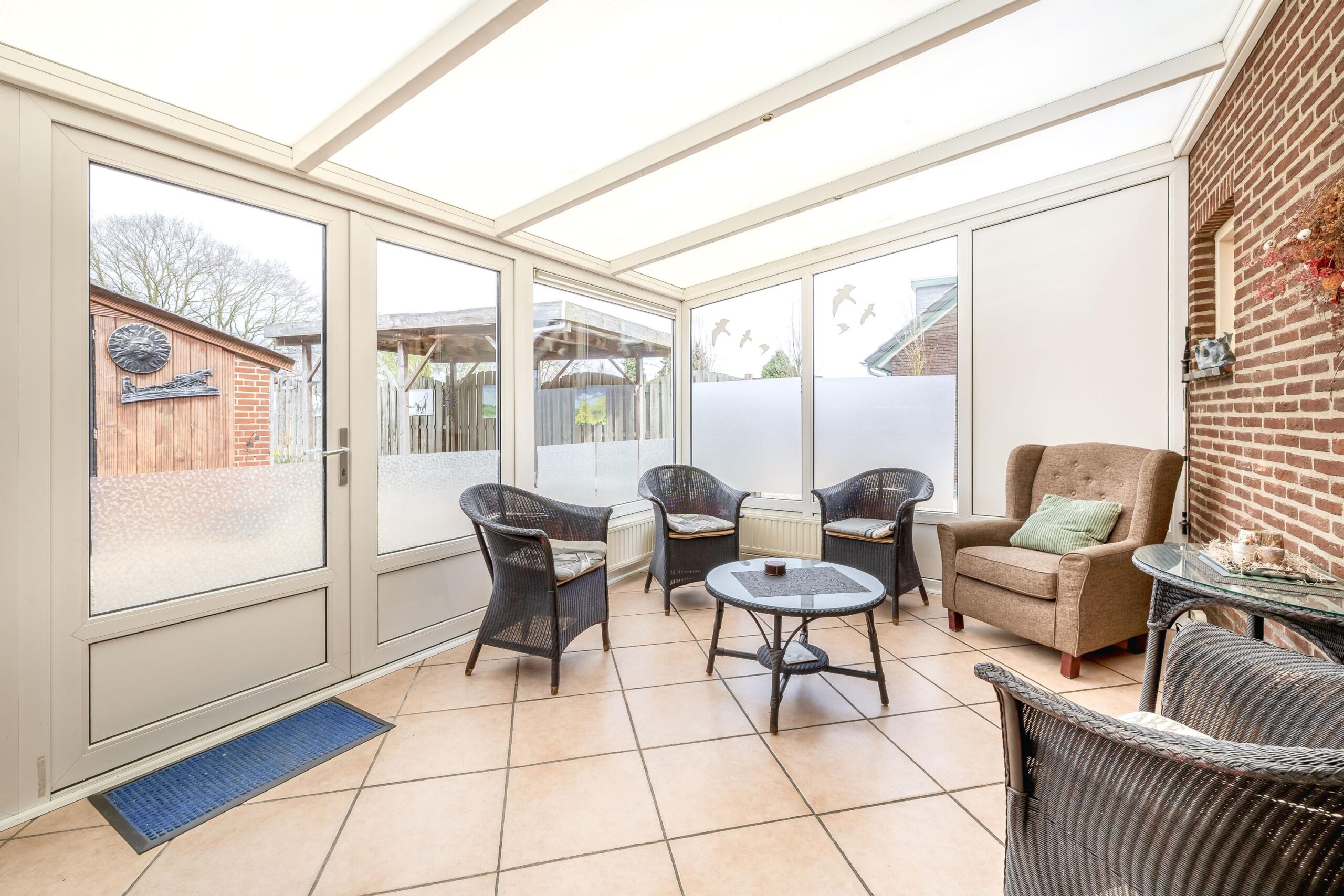 De ruime serre heeft openslaande deuren naar de tuin. Ook hier ligt een tegelvloer.
