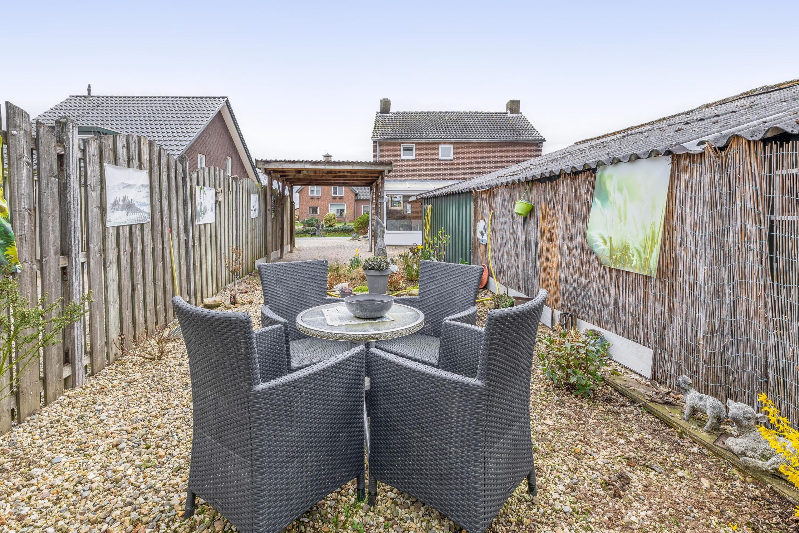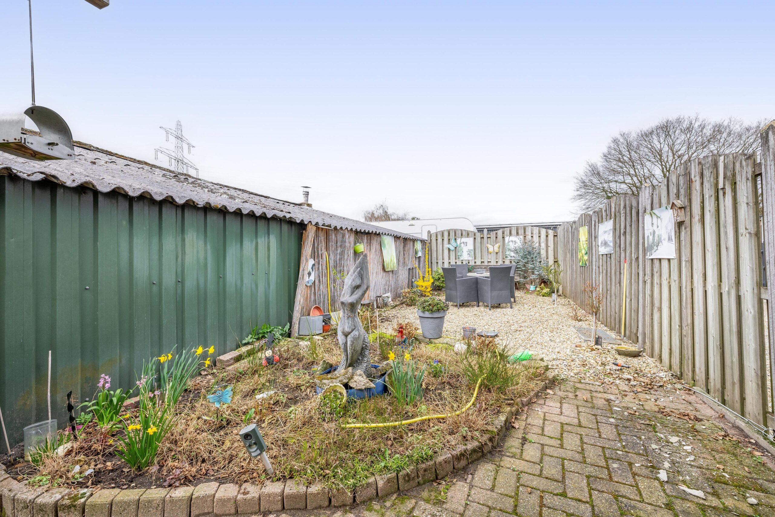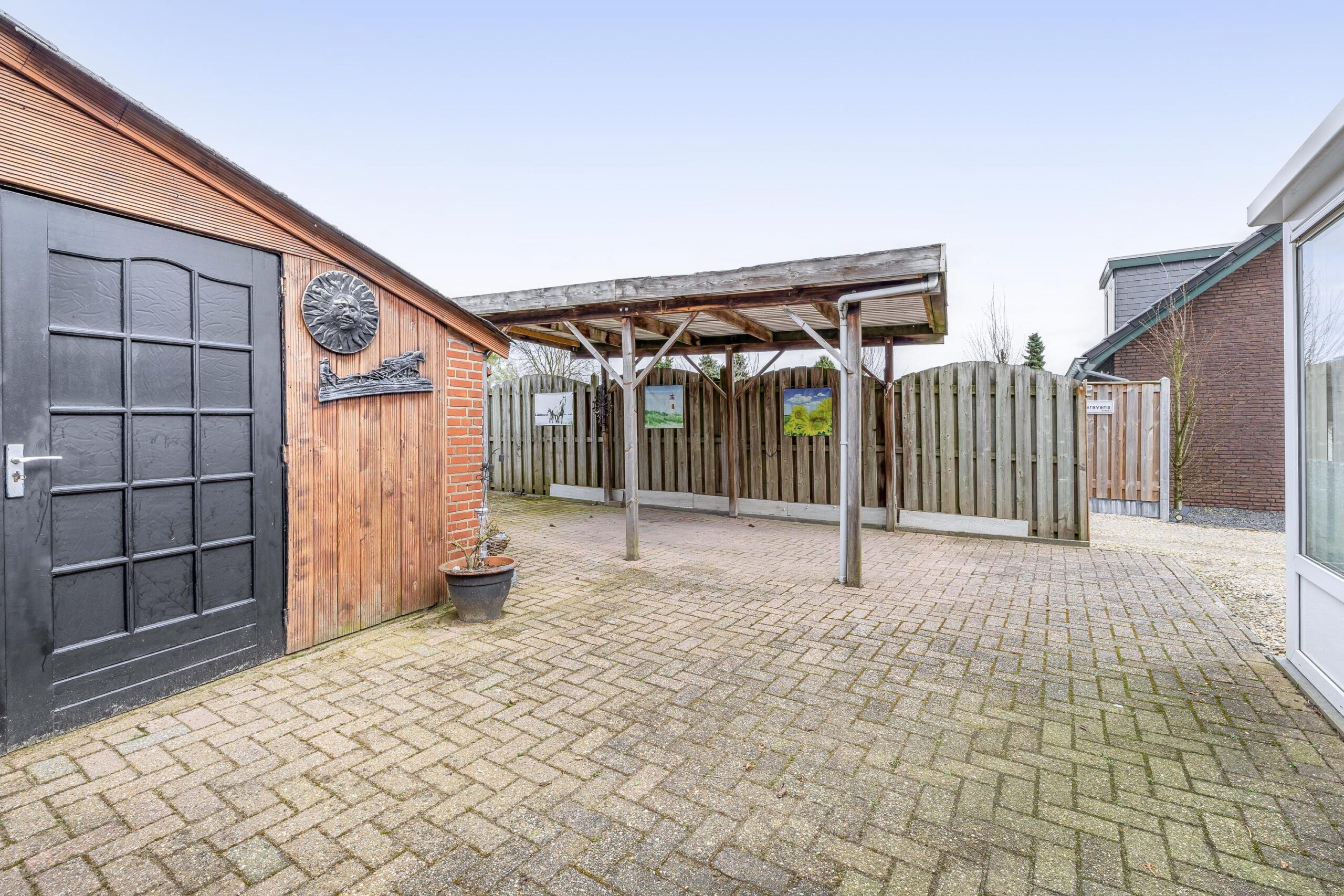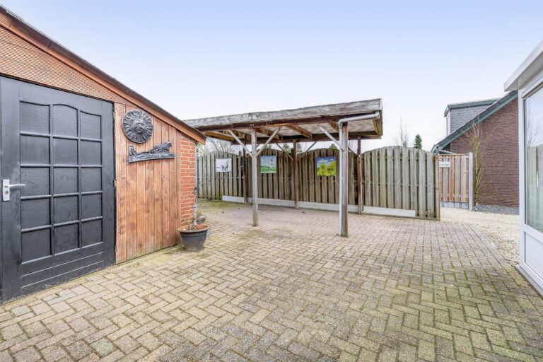 De tuin loopt rondom de woning en aan beide zijdes is een oprit aanwezig waar plek is voor meerdere auto’s. Onder de houten carport is nog een extra parkeerplek aanwezig.