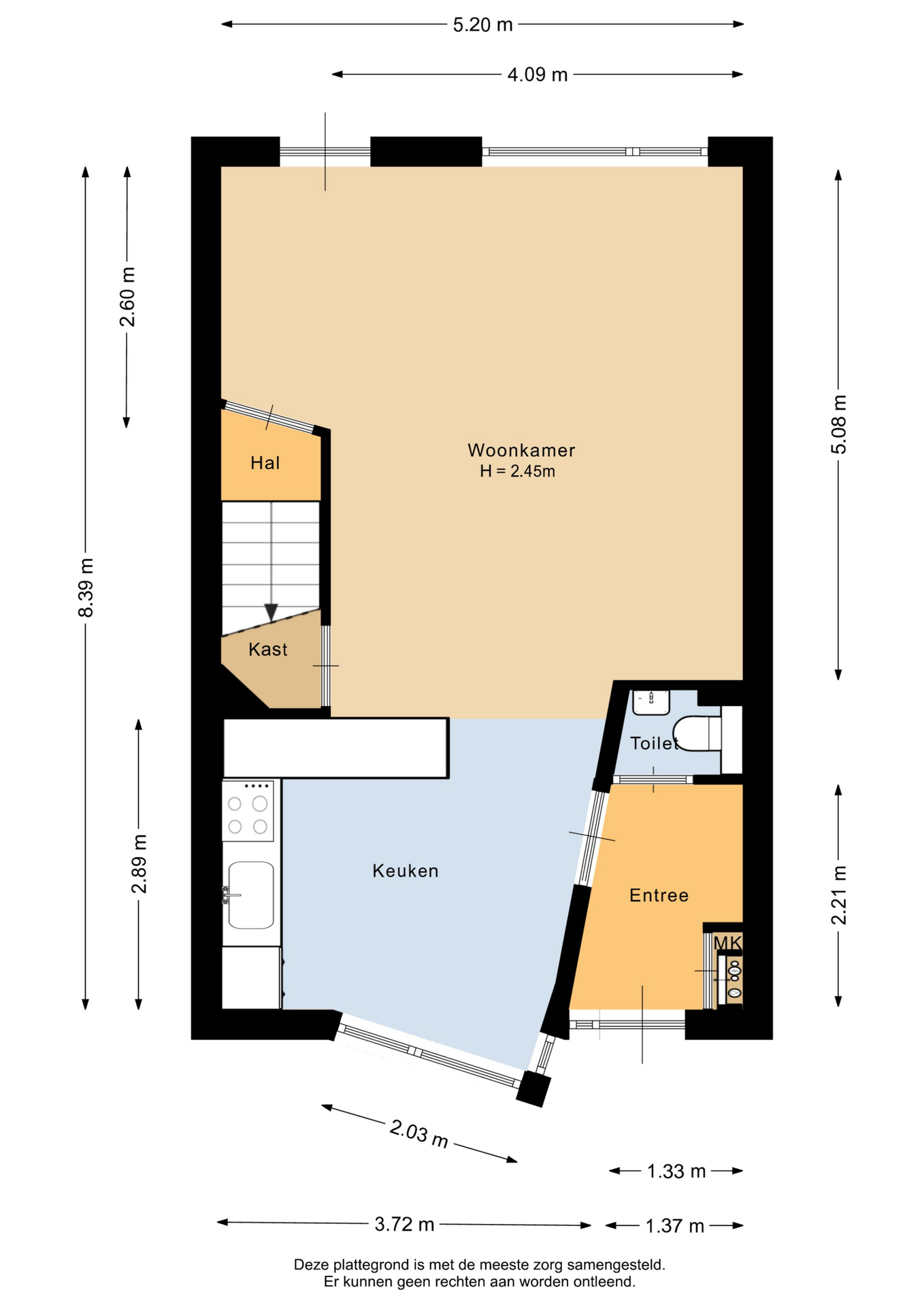 In de hal zijn de meterkast en het toilet met fonteintje aanwezig. Op de begane grond ligt een doorlopende laminaatvloer.
