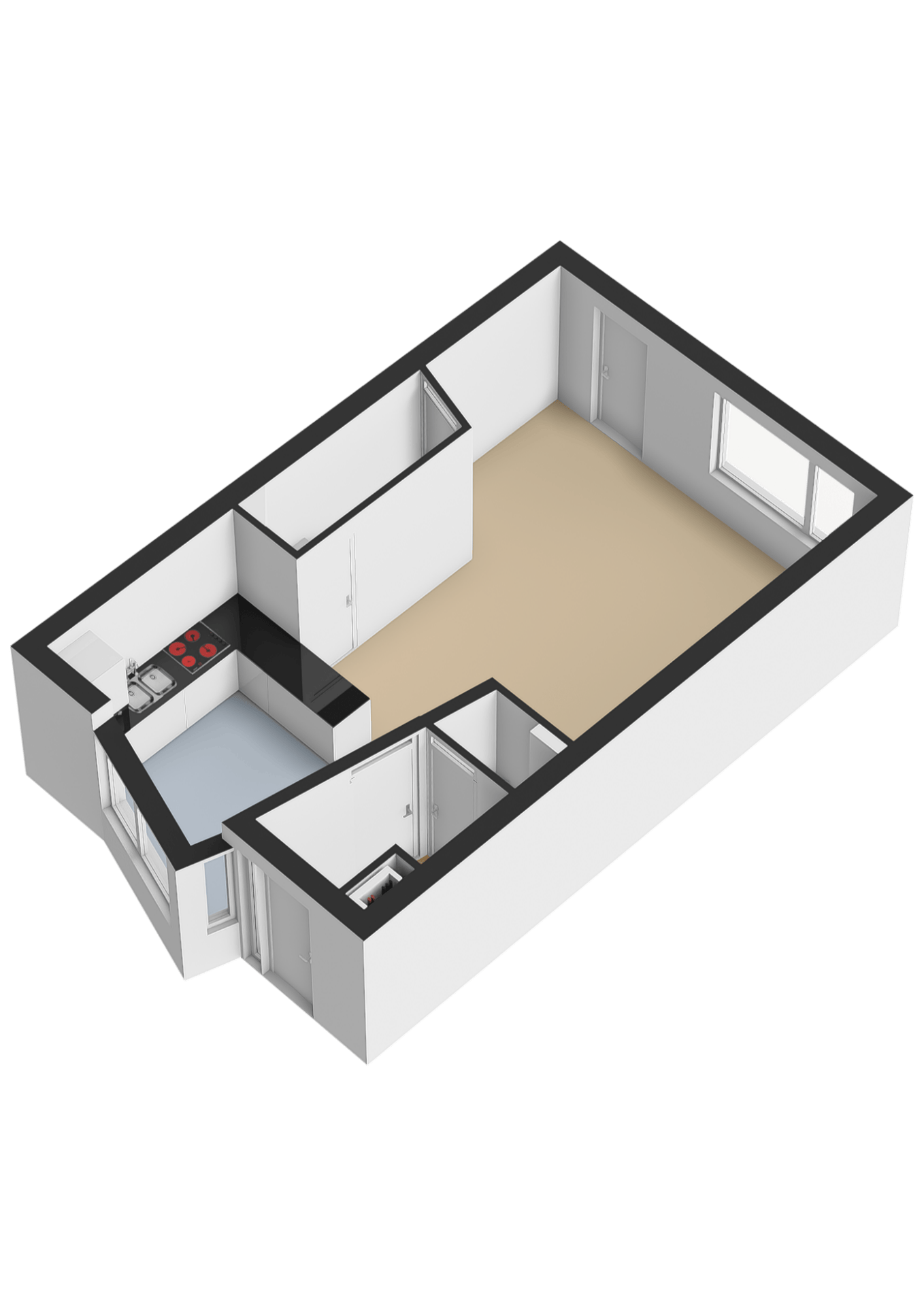 In de lichte woonkamer bevinden zich een trapkast voor extra bergruimte en de afgesloten trap naar de 1ste verdieping. Aan de achterzijde biedt de loopdeur directe toegang tot de achtertuin. Voorin staat de open keuken in een L-opstelling. Deze is voorzien van een vaatwasser, oven, koelkast en keramische kookplaat.