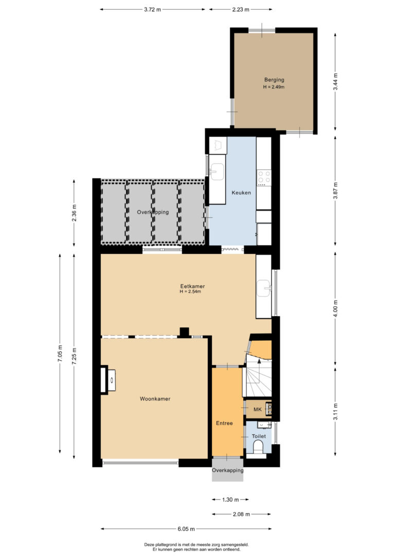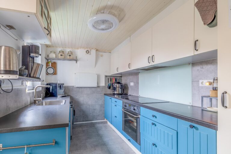 De keuken is uitgerust met een inductiekookplaat, afzuigkap, oven, vaatwasser en een grote, losse koelkast met diepvries. Er ligt een laminaatvloer en er is een witgoedaansluiting aanwezig. Een loopdeur biedt toegang tot de tuin en er is tevens een kleine vliering bereikbaar.