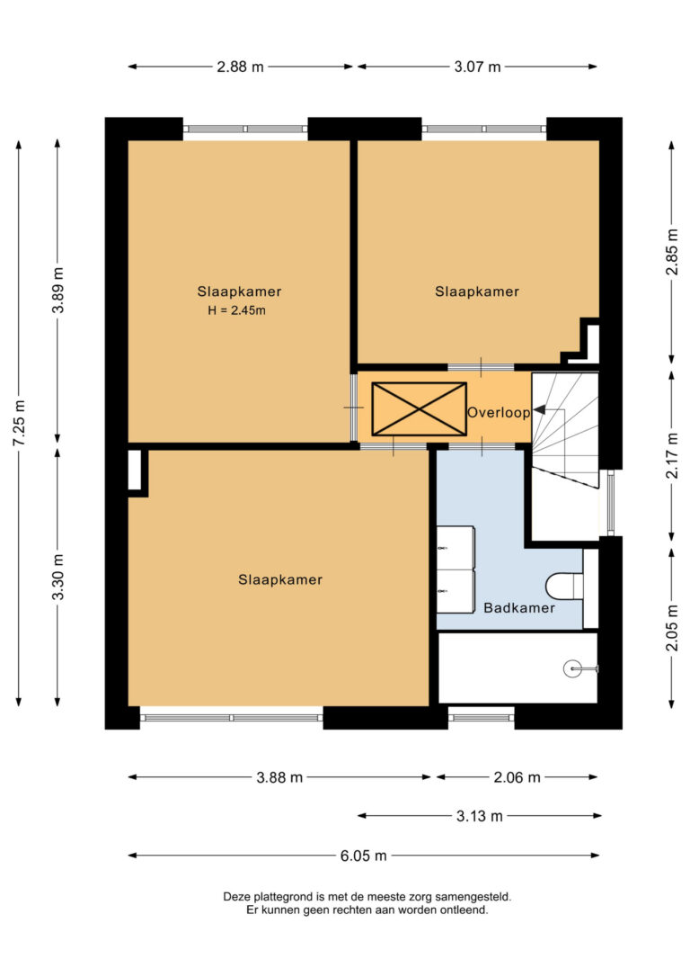Vanuit de overloop zijn de drie slaapkamers en de badkamer bereikbaar.
